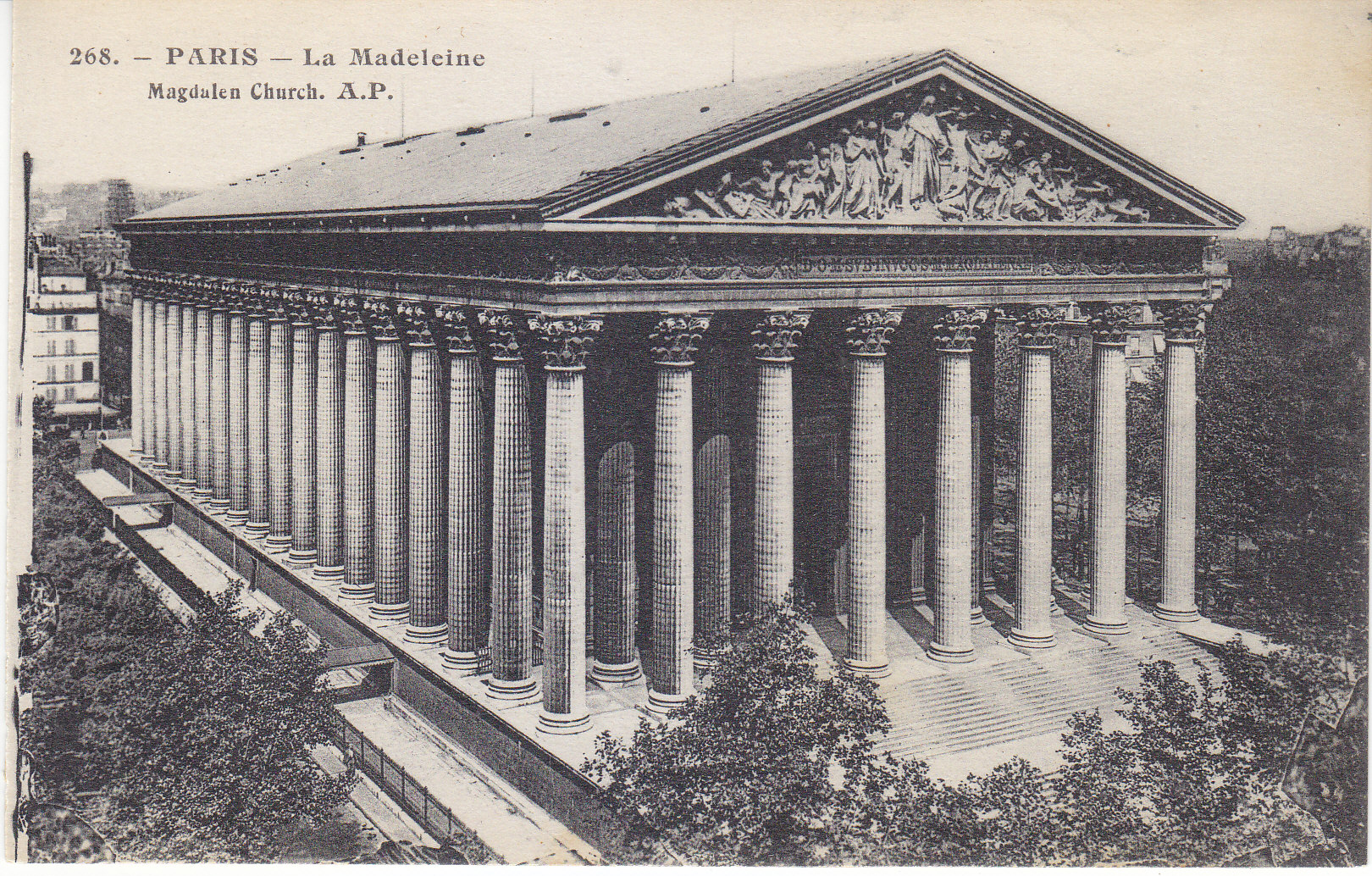 POSTCARD #011 La Madeleine [Magdalen Church, Paris, France]. 268. A.P., E. Papeghin, 24 Rue des Petites-Ecuries, Paris. 5.5" x 3.5" VG