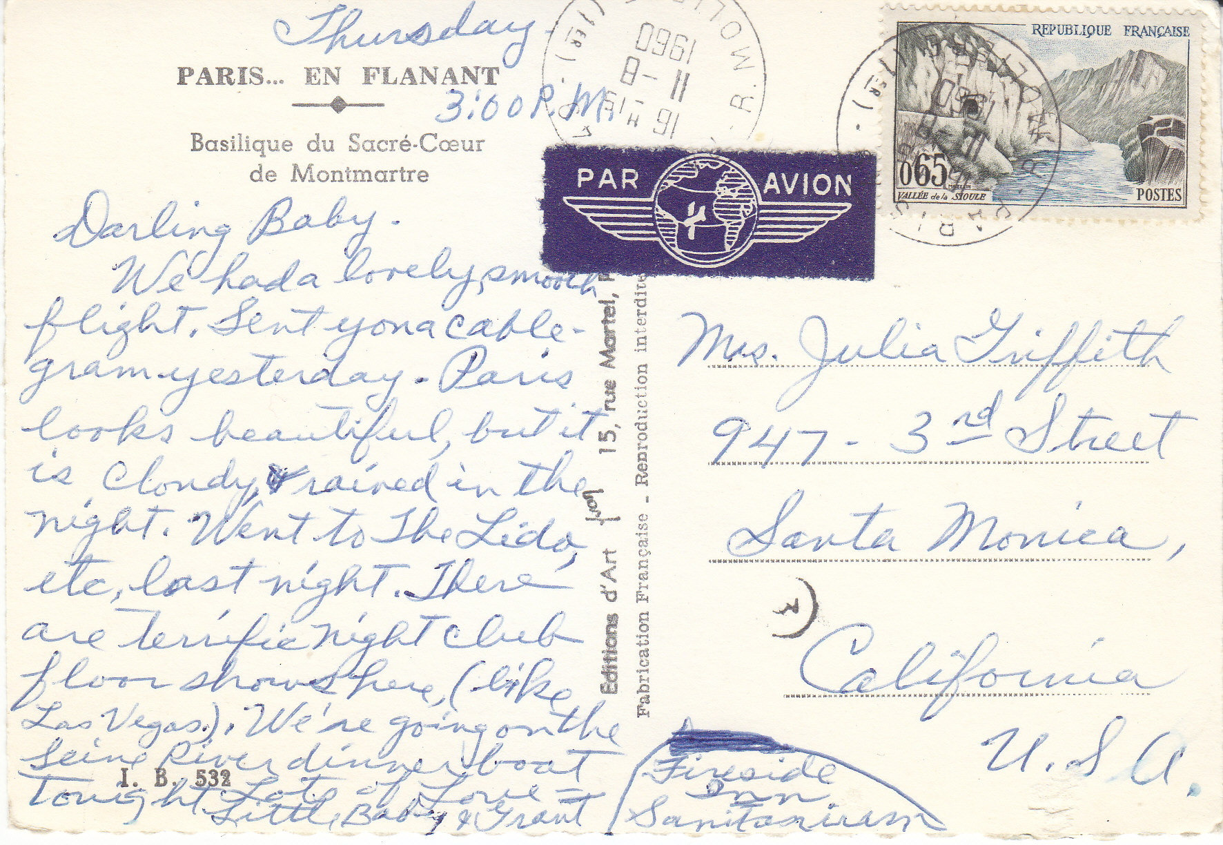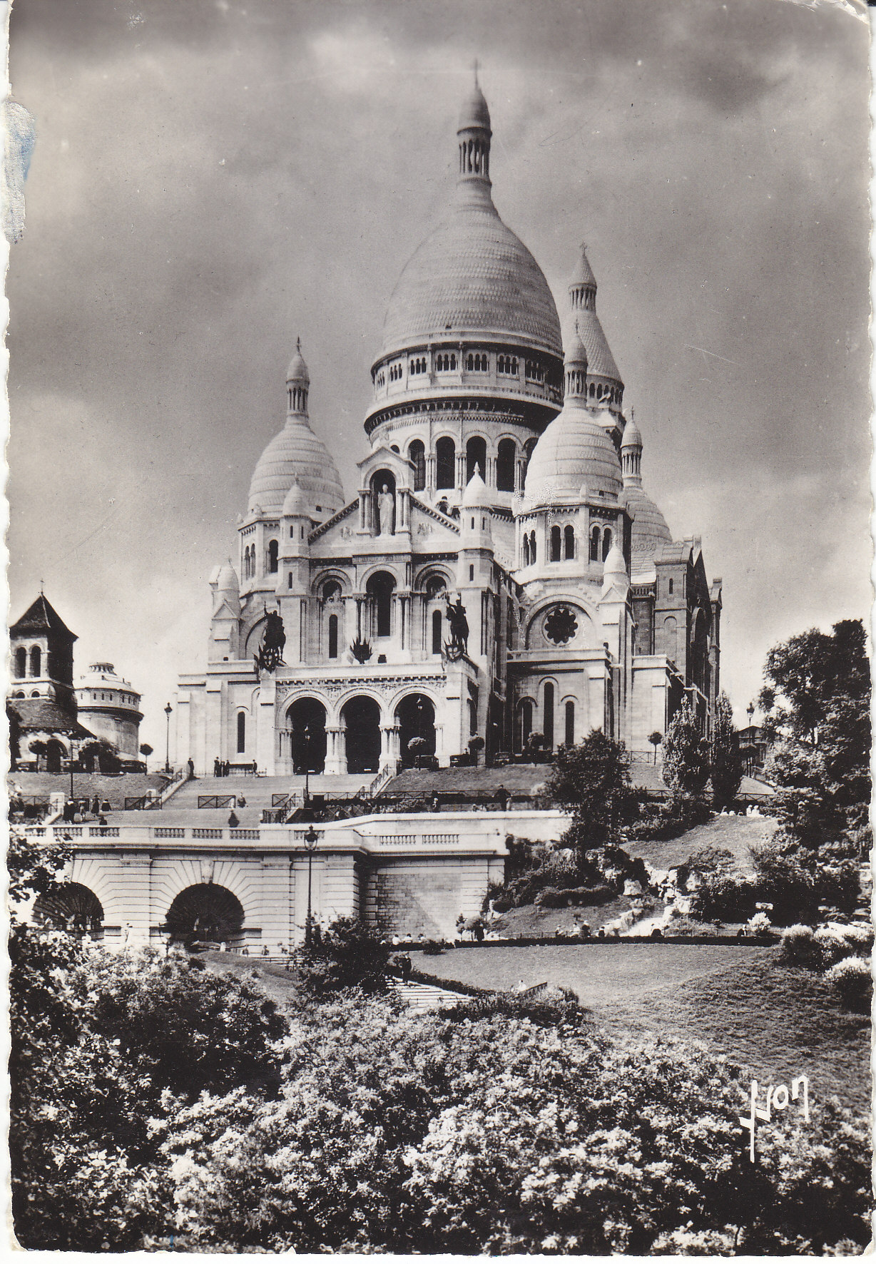 POSTCARD #017 Basilique du Sacré-Coeur de Montmartre, Paris [France], en Flânant [Strolling]. I.B. 532. Editions of Art, Yvon (Pierre Yves-Petit, 1886-1969), 15 rue Martel, Paris. Fabrication Francaise [Made in France]. Deckled edges. 4" x 6" GD