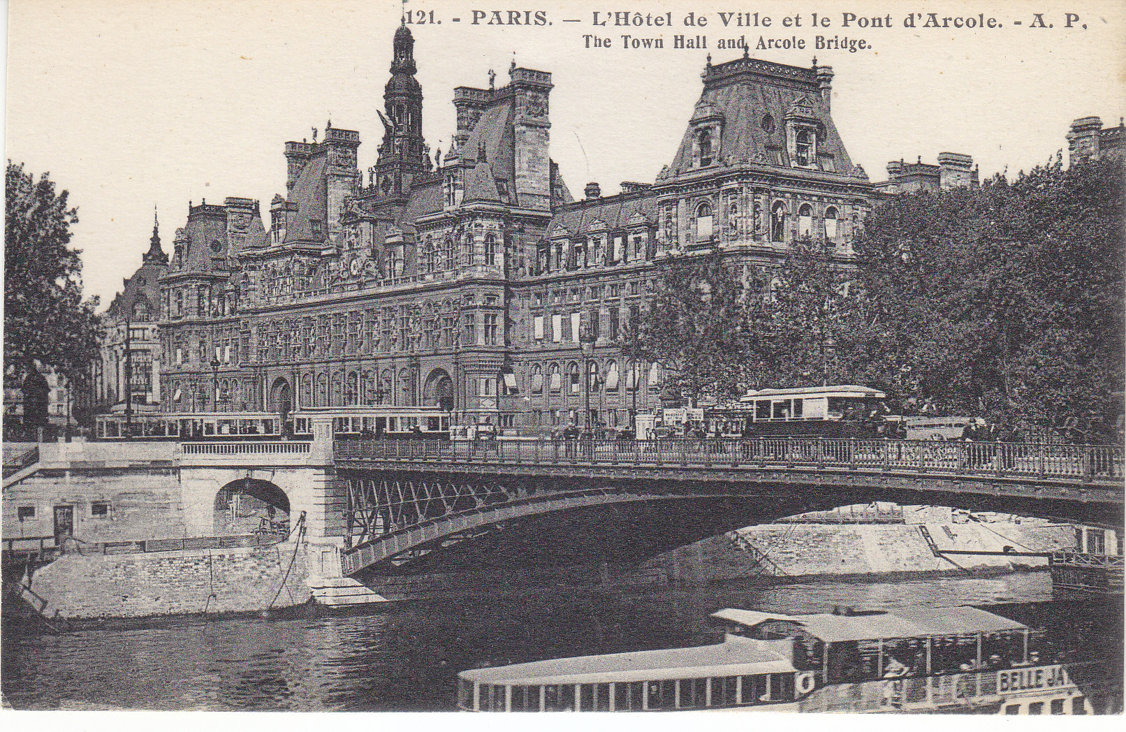 POSTCARD #020 L'Hôtel de Ville et le Pont d'Arcole [The Town Hall and Arcole Bridge, Paris, France]. 121. A.P. E. Papeghin, 24 Rue des Petites-Ecuries, Paris. 5.5" x 3.5" EXC