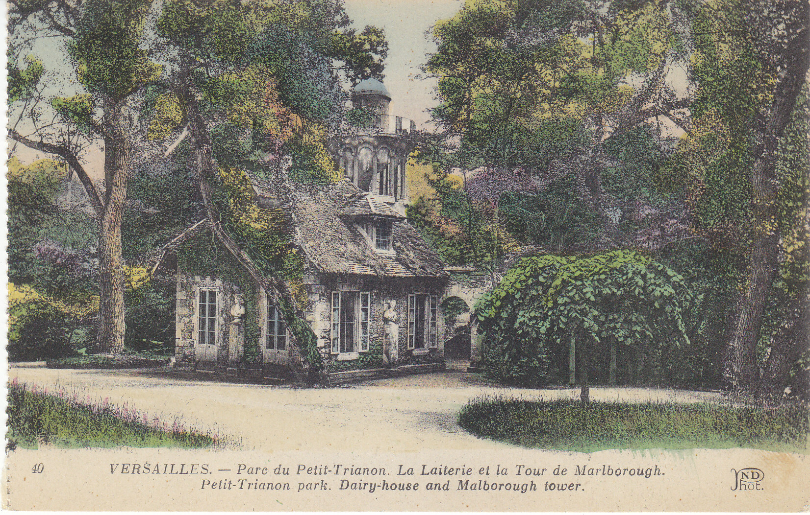 POSTCARD #029 Parc du Petit-Trianon, La Laiterie et la Tour de Marlborough [Petit-Trianon Park, Dairy-house and Marlborough Tower, Versailles, France]. 40. Ancien Estab. Neurdein et Cie. Imp. Crete, Succ, Corbeil, Paris, 52 Av. de Breteuil, Paris. 5.5" x 3.5" VG