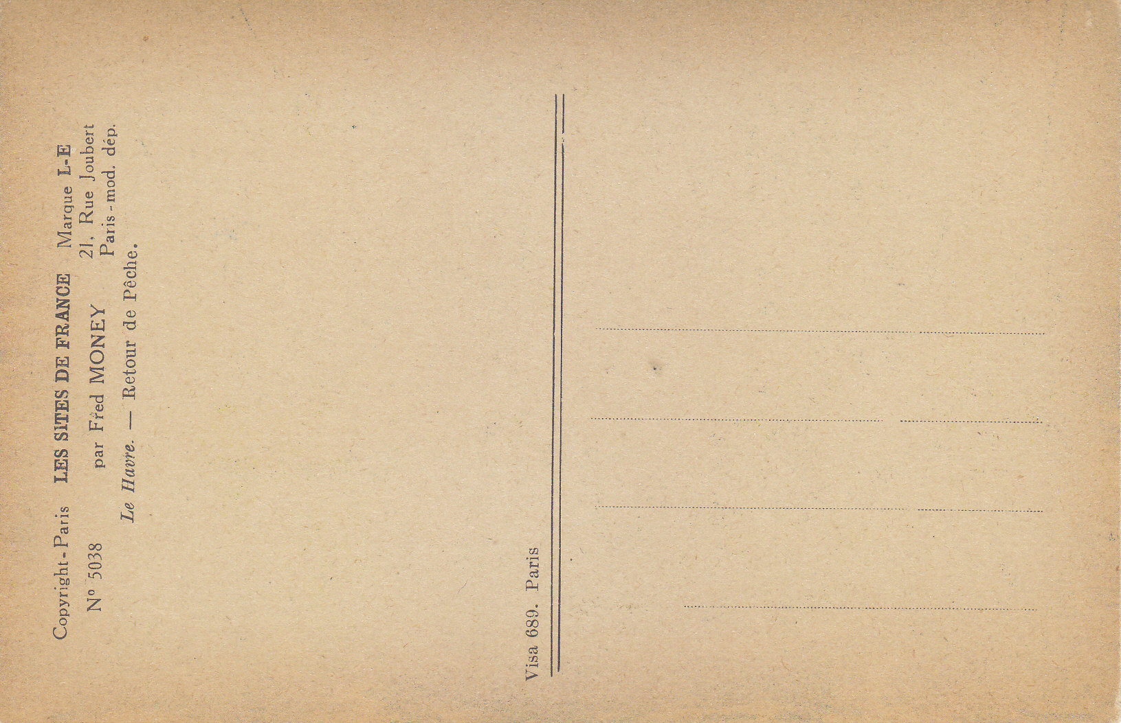 POSTCARD #032 Retour de Peche, Le Havre [France]. Par Fred Money [artist]. Les Sites de France. Copyright Paris No. 5038. Marque L-E, 21 Rue Joubert, Paris, mod. dep. 5.5" x 3.5" EXC
