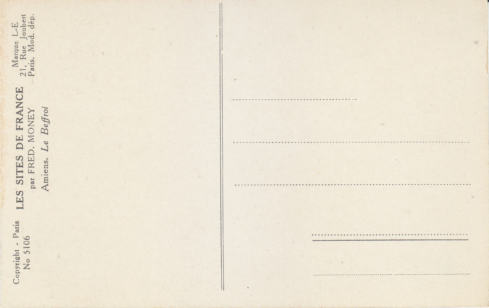 POSTCARD #033 Le Beffroi, Amiens [France]. Par Fred Money [artist]. Les Sites de France. Copyright Paris No. 5106. Marque L-E, 21 Rue Joubert, Paris, mod. dep. 3.5" x 5.5" EXC