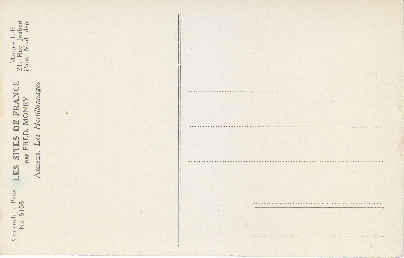 POSTCARD #034 Les Hortillonnages, Amiens [France]. Par Fred Money [artist]. Les Sites de France. Copyright Paris No. 5108. Marque L-E, 21 Rue Joubert, Paris, mod. dep. 5.5" x 3.5" EXC