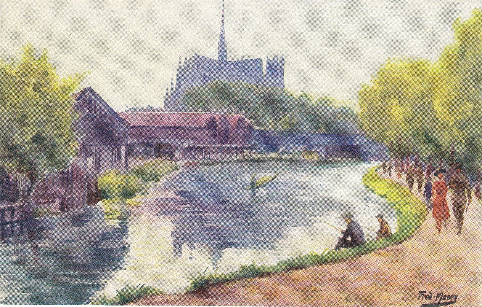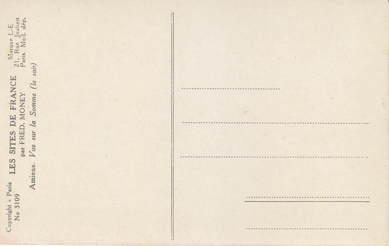 POSTCARD #035 Vue sur la Somme (le soir), Amiens [Evening view of the Somme River, Amiens, France]. Par Fred Money [artist]. Les Sites de France. Copyright Paris No. 5109. Marque L-E, 21 Rue Joubert, Paris, mod. dep. 5.5" x 3.5" EXC