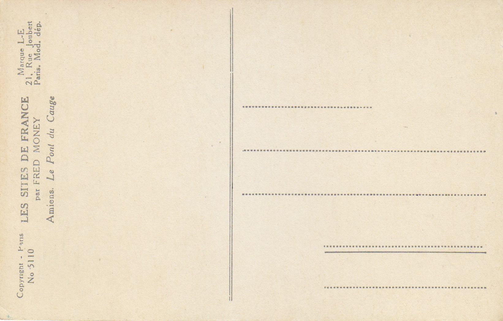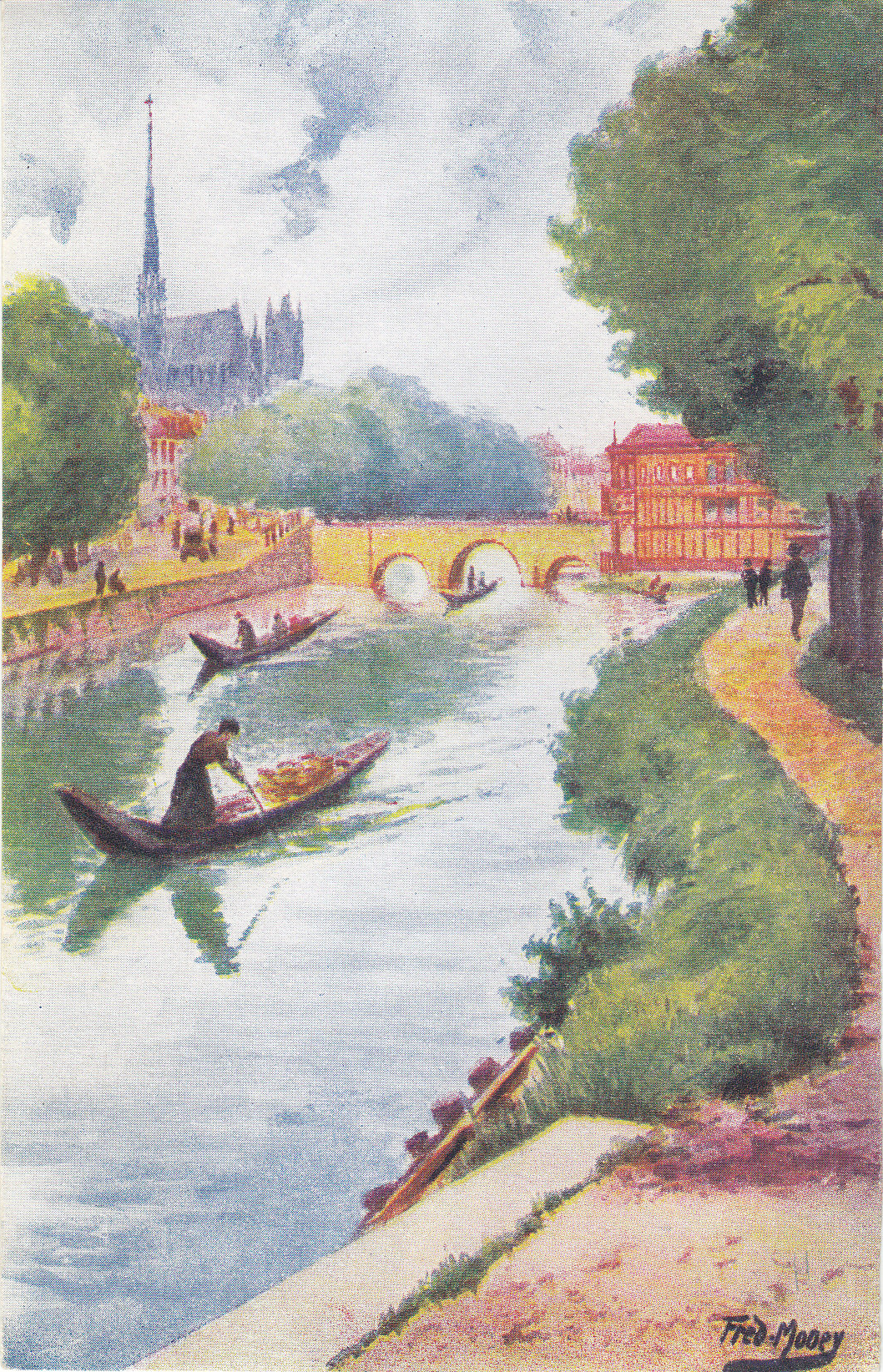 POSTCARD #036 Le Pont du Caugé, Amiens [Bridge of Caugé commune, Amiens, France]. Par Fred Money [artist]. Les Sites de France. Copyright Paris No. 5110. Marque L-E, 21 Rue Joubert, Paris, mod. dep. 3.5" x 5.5" EXC