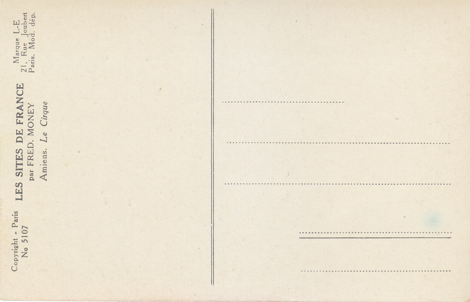 POSTCARD #037 Le Cirque, Amiens [The Circus, Amiens, France]. Par Fred Money [artist]. Les Sites de France. Copyright Paris No. 5107. Marque L-E, 21 Rue Joubert, Paris, mod. dep. 5.5" x 3.5" EXC