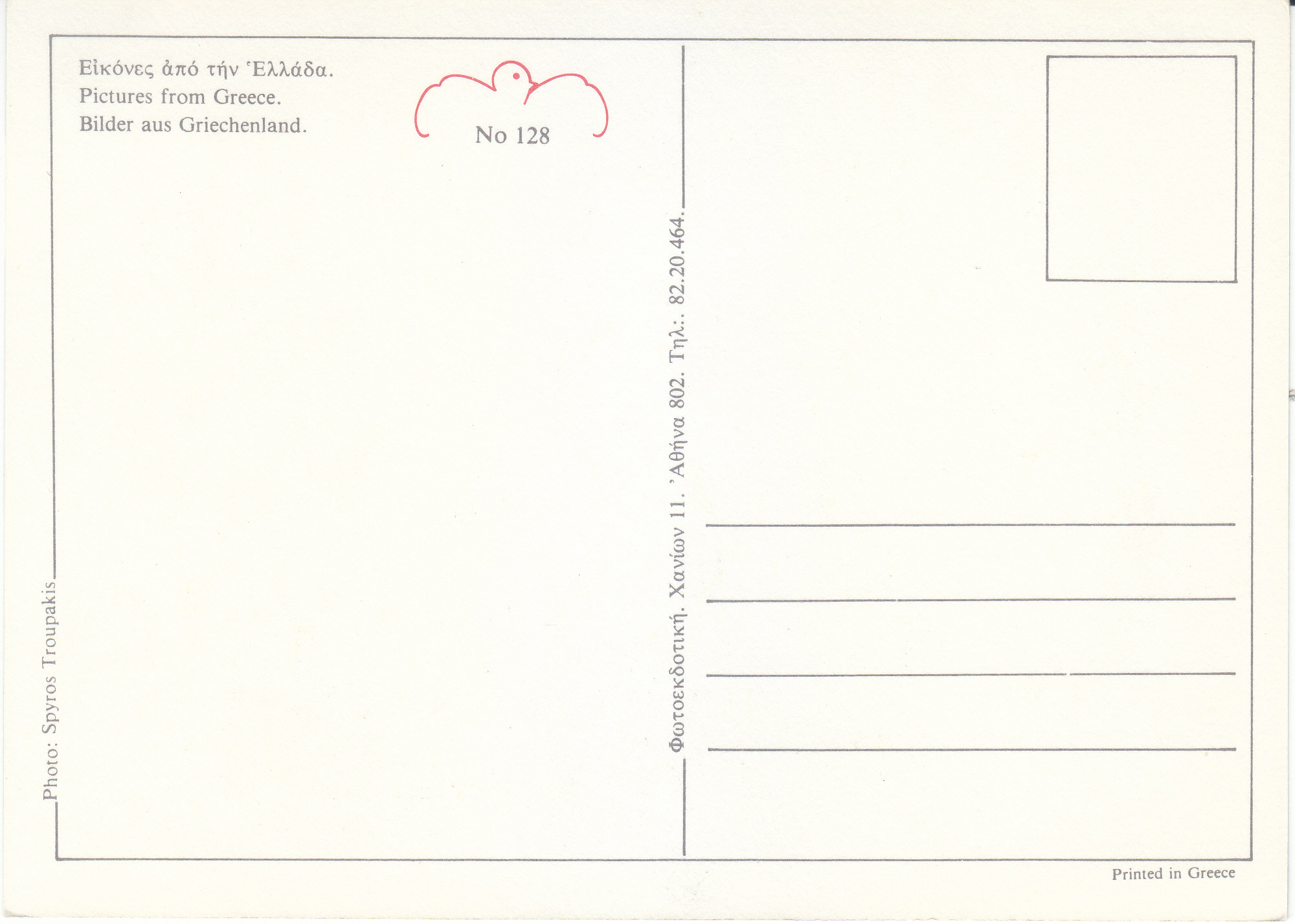POSTCARD #078 Picture from Greece [also written in Greek and German]. No. 128. Phot: Spyros Troupakis. [Printer's address in Greek]. Printed in Greece. 4.75" x 6.5" EXC