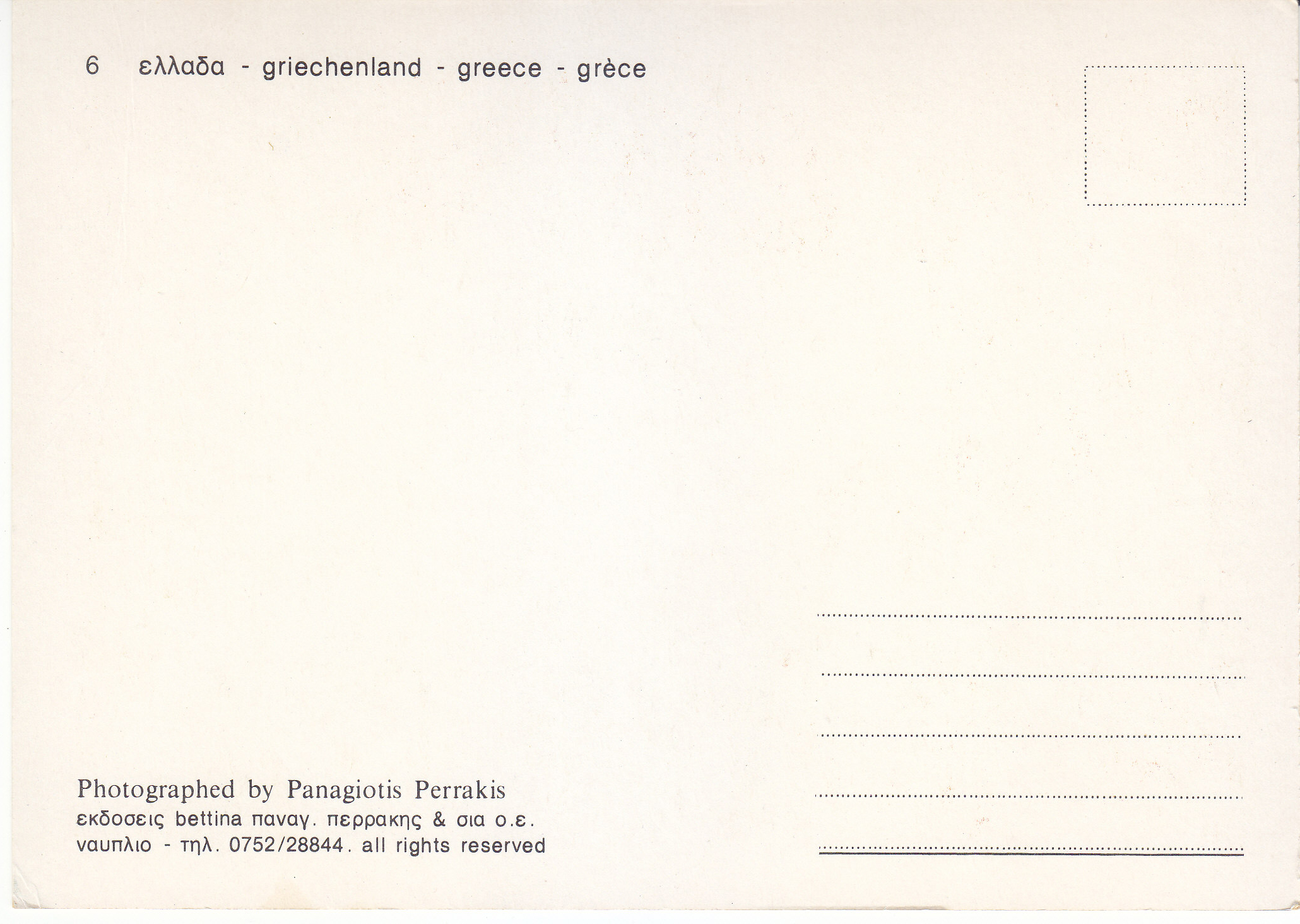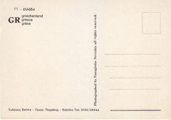 POSTCARD #079 Greece. [Also written in Greek, German, and another language; Address also in Greek.] Photographed by Panagiotis Perrakis. 6. All rights reserved. 4.75" x 6.5" EXC