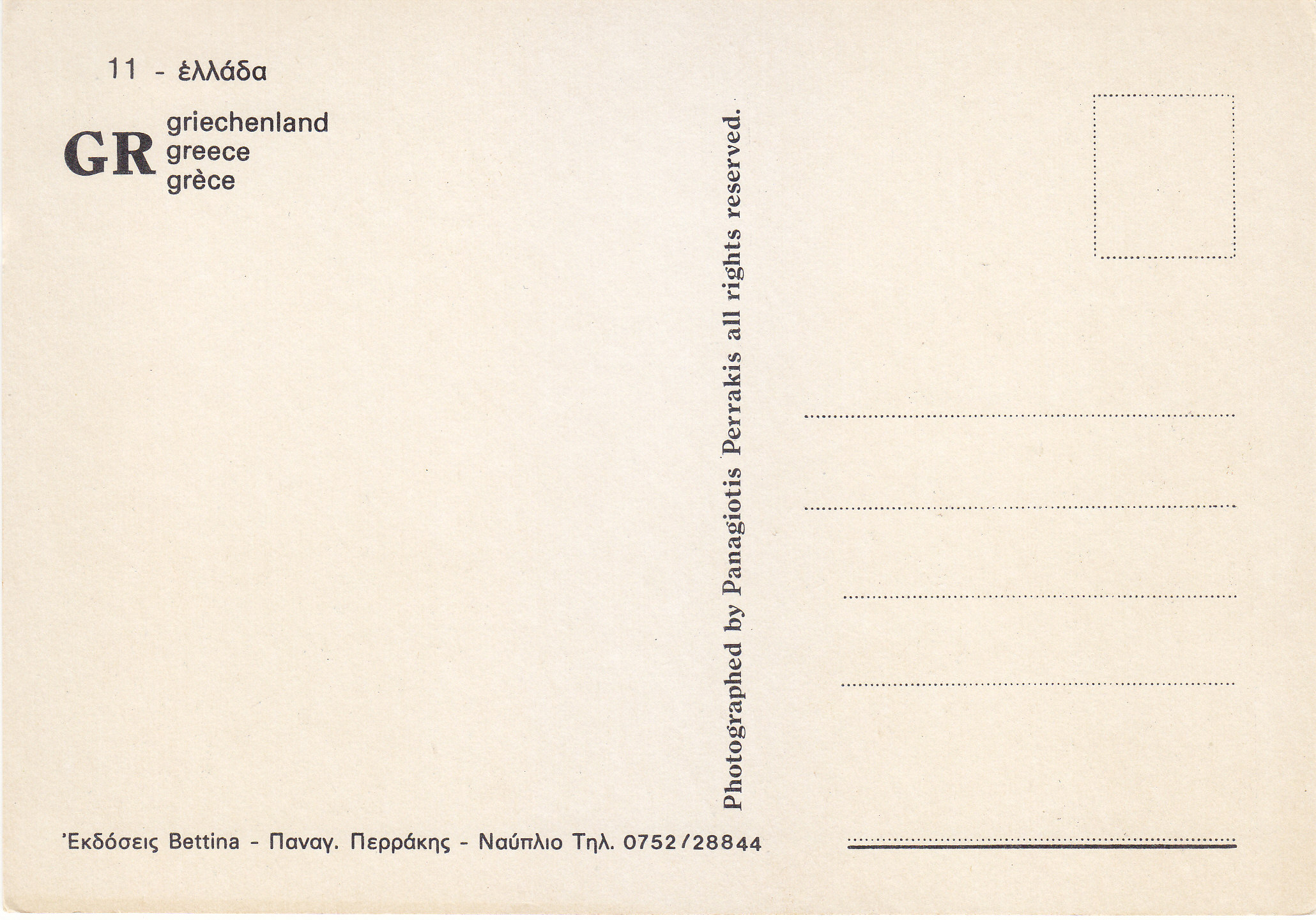 POSTCARD #082 Greece. [Also written in Greek, German, and another language.] Bettina. Photographed by Panagiotis Perrakis. 11. All rights reserved. 4.75" x 6.5" EXC