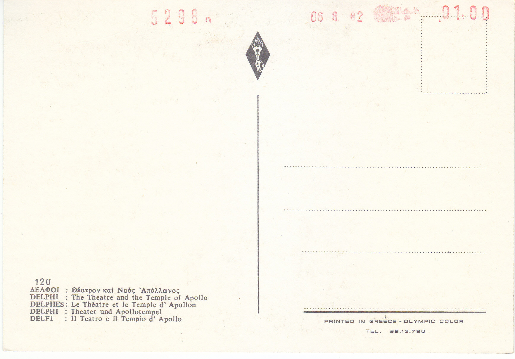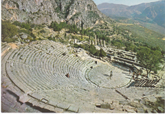 POSTCARD #093 The Theatre and the Temple of Apollo [Also written in Greek and other languages.] Greece. 120. Printed in Greece - Olympic Color, Tel. 99.13.790. 5.75" x 4" EXC