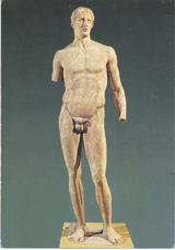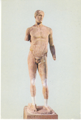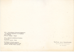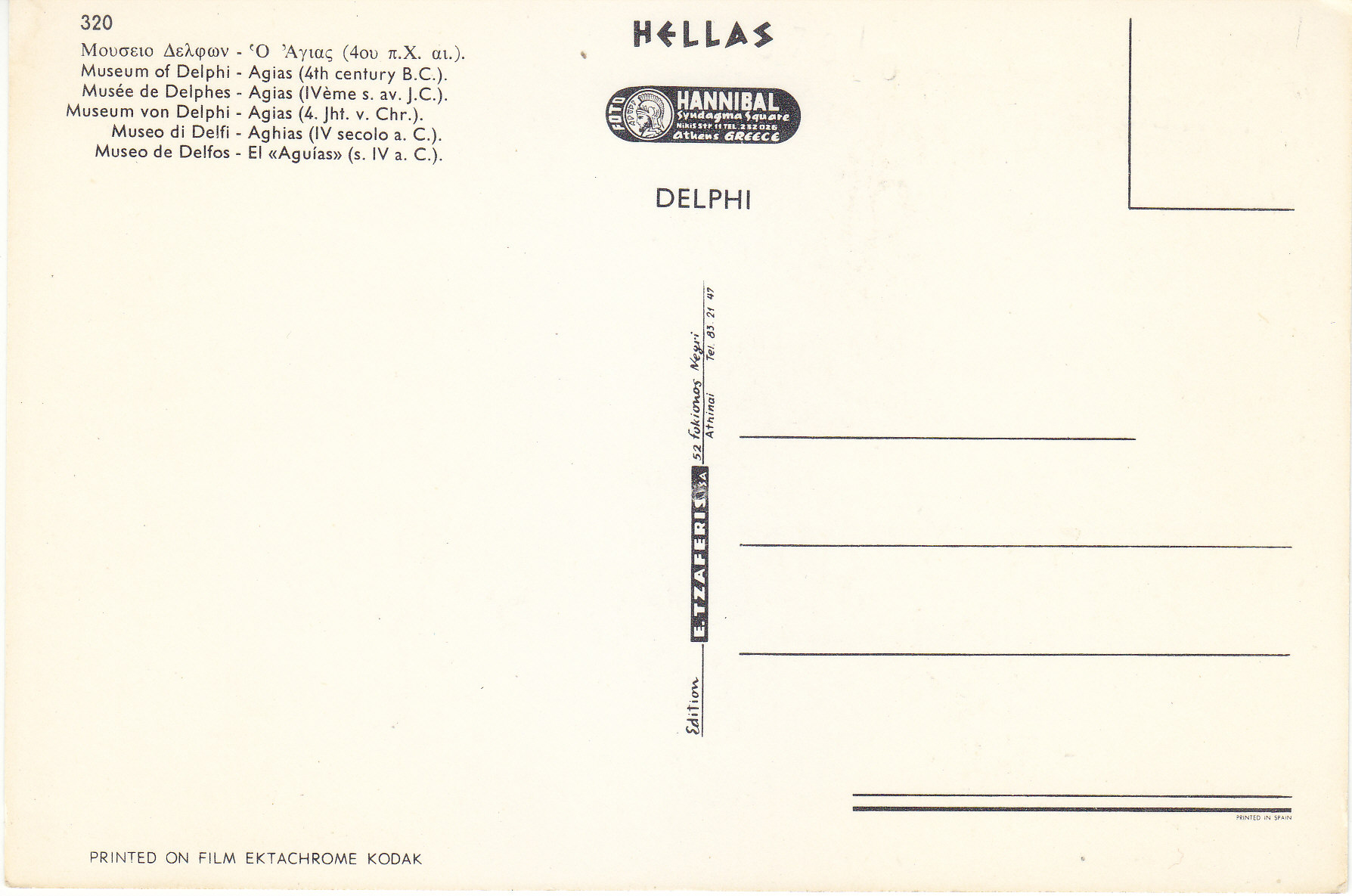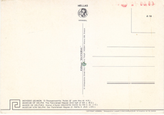 POSTCARD #111 Museum of Delphi. Agias (4th century B.C.) [Greece]. [Also written in Greek and other languages.] 320. Printed on Film Ektachrome Kodak. Hellas. Delphi. Hannibal Syndagma Square, Nikis Str, 11, Tel 232 026, Athens, Greece. Edition E. Tzaferis SA 52 Fokionos, Athinai, Tel. 83 21 47. Printed in Spain. 4" x 6" EXC