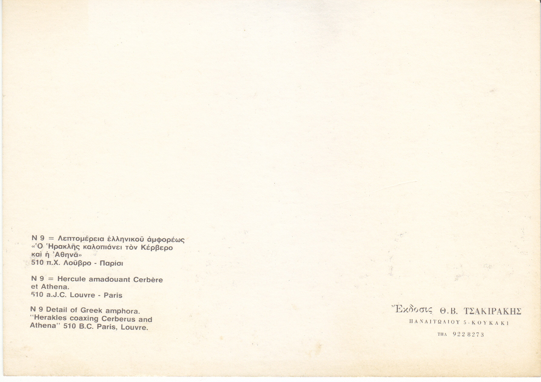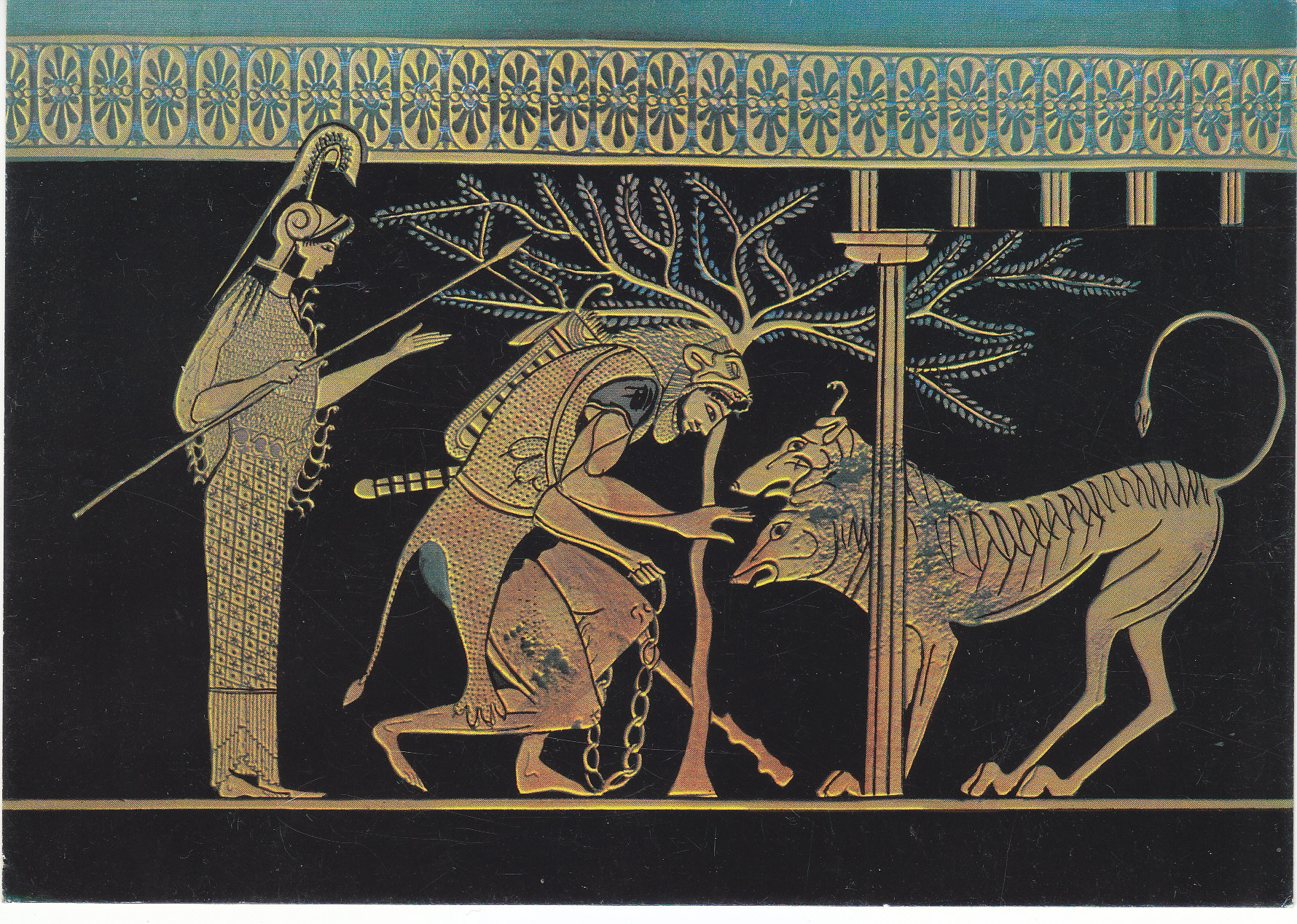 POSTCARD #139 Detail of Greek amphora. "Herakles coaxing Cerberus and Athena." 510 B.C., Paris, Louvre. N-9. [Address in Greek.] 6" x 4.25" EXC