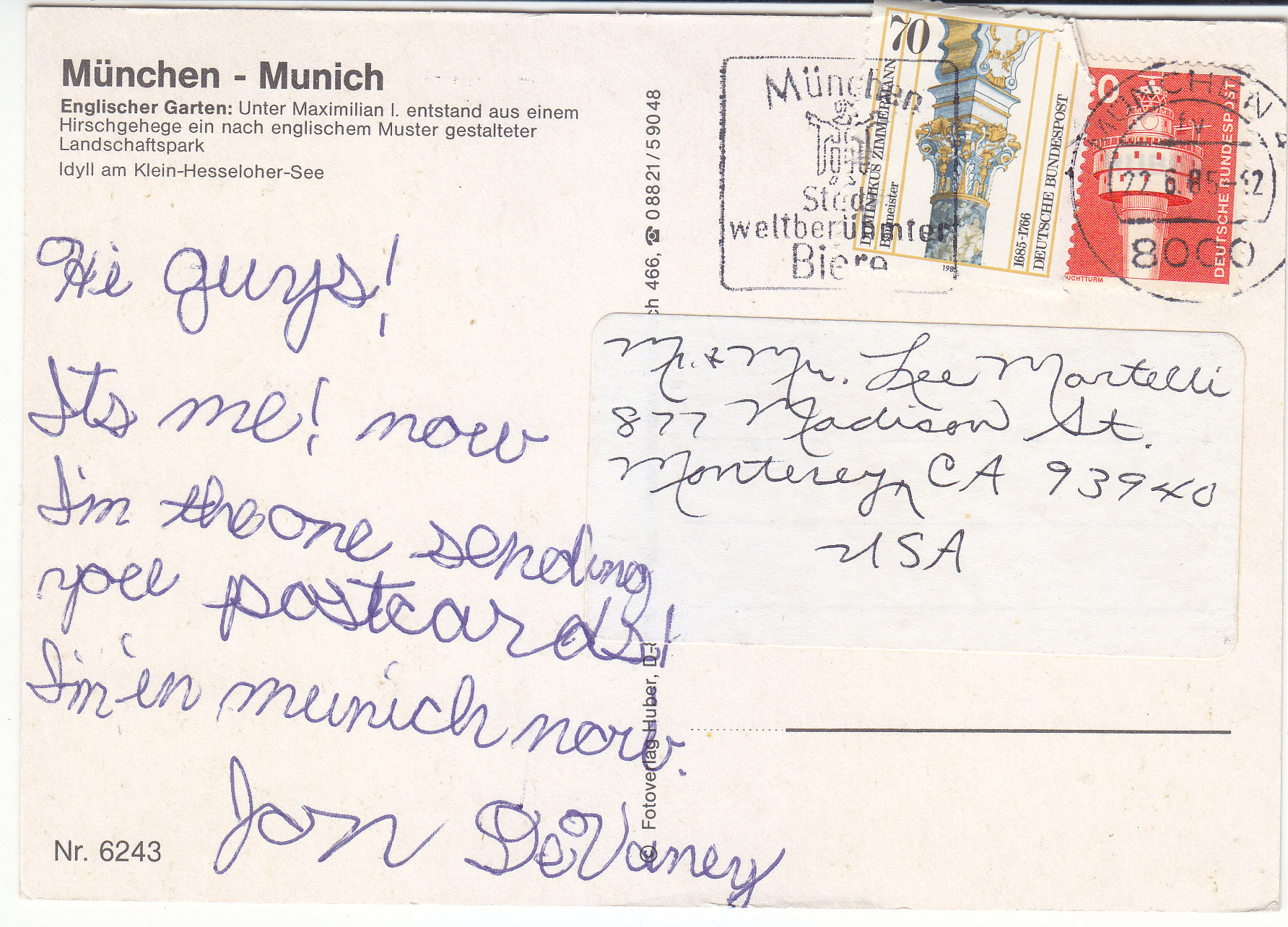 POSTCARD #160 Munich [Germany]. English Garden under Maximillian I. Nr. 6243. Copyright Fotoverlag Huber [address obscured by mailing label]. 5.75" x 4" VG