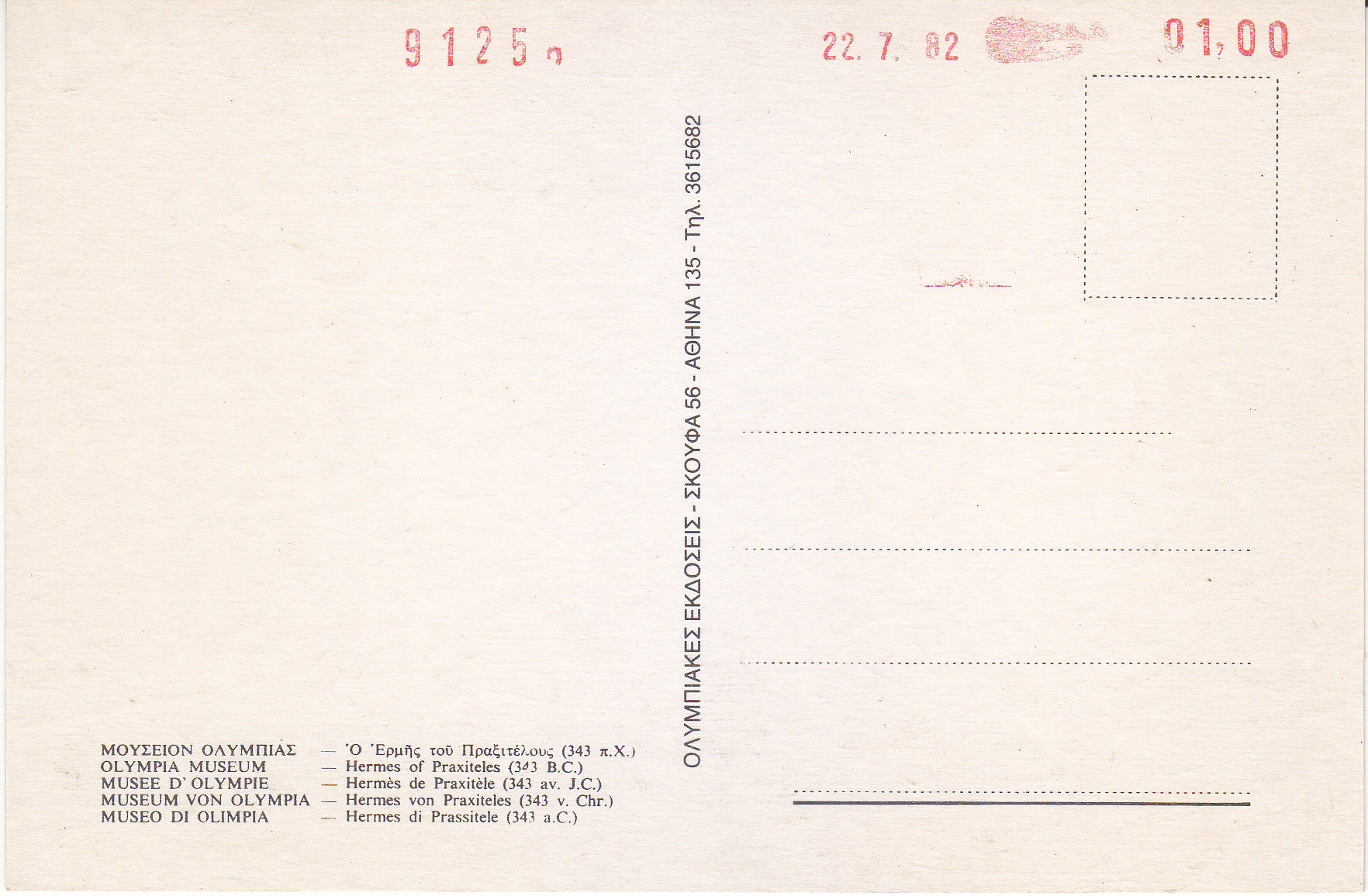 POSTCARD #169 Hermes of Praxiteles (343 B.C.). Olympia Museum [Olympia, Greece]. [Address in Greek.]. 5.75" x 3.75" VG