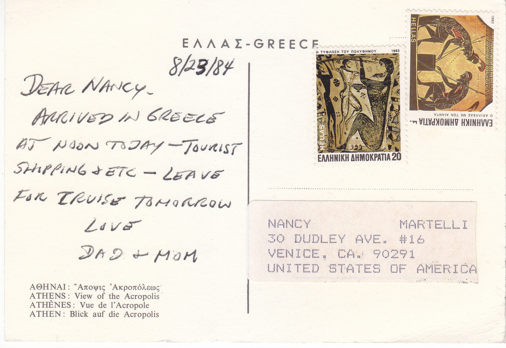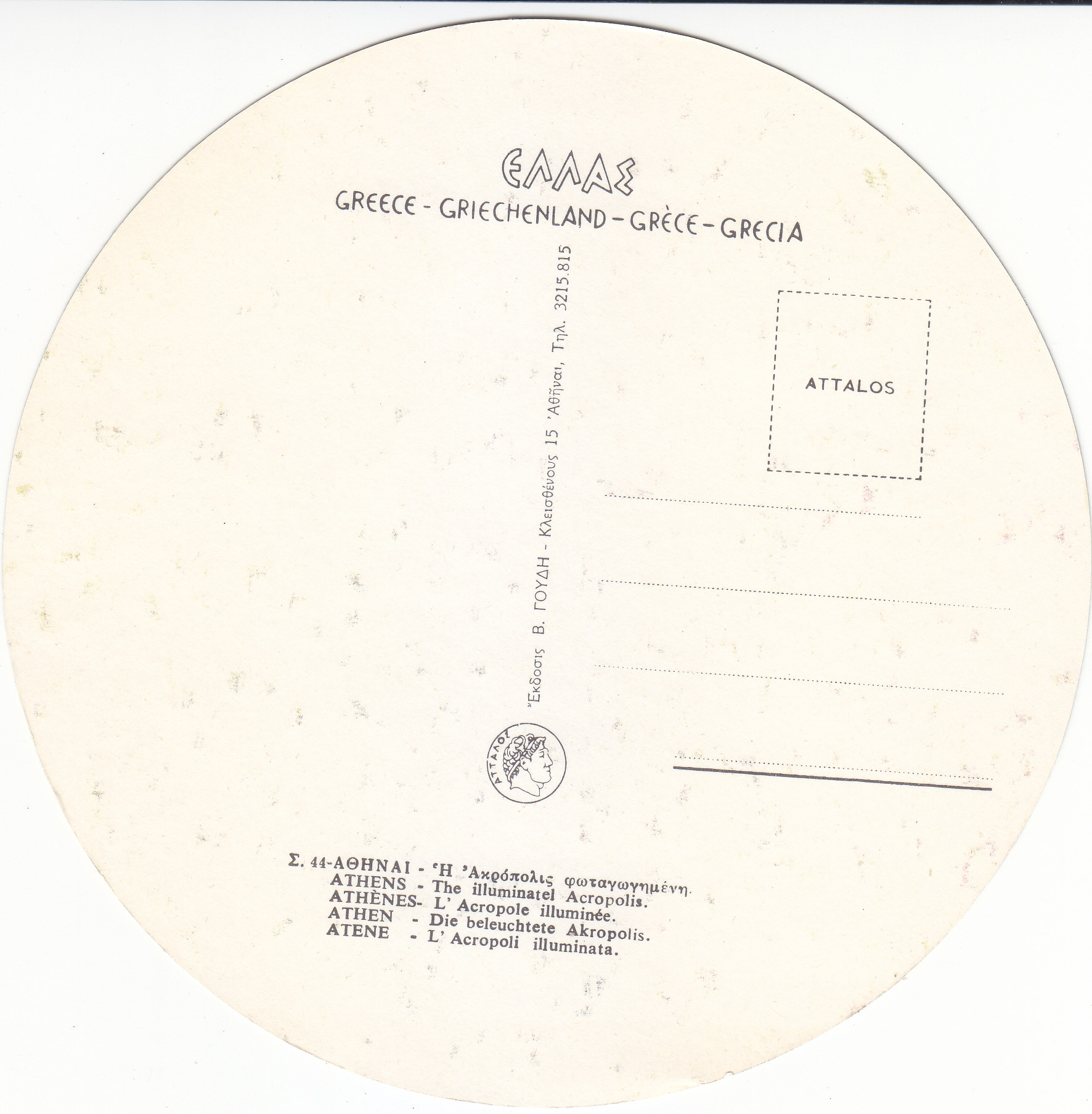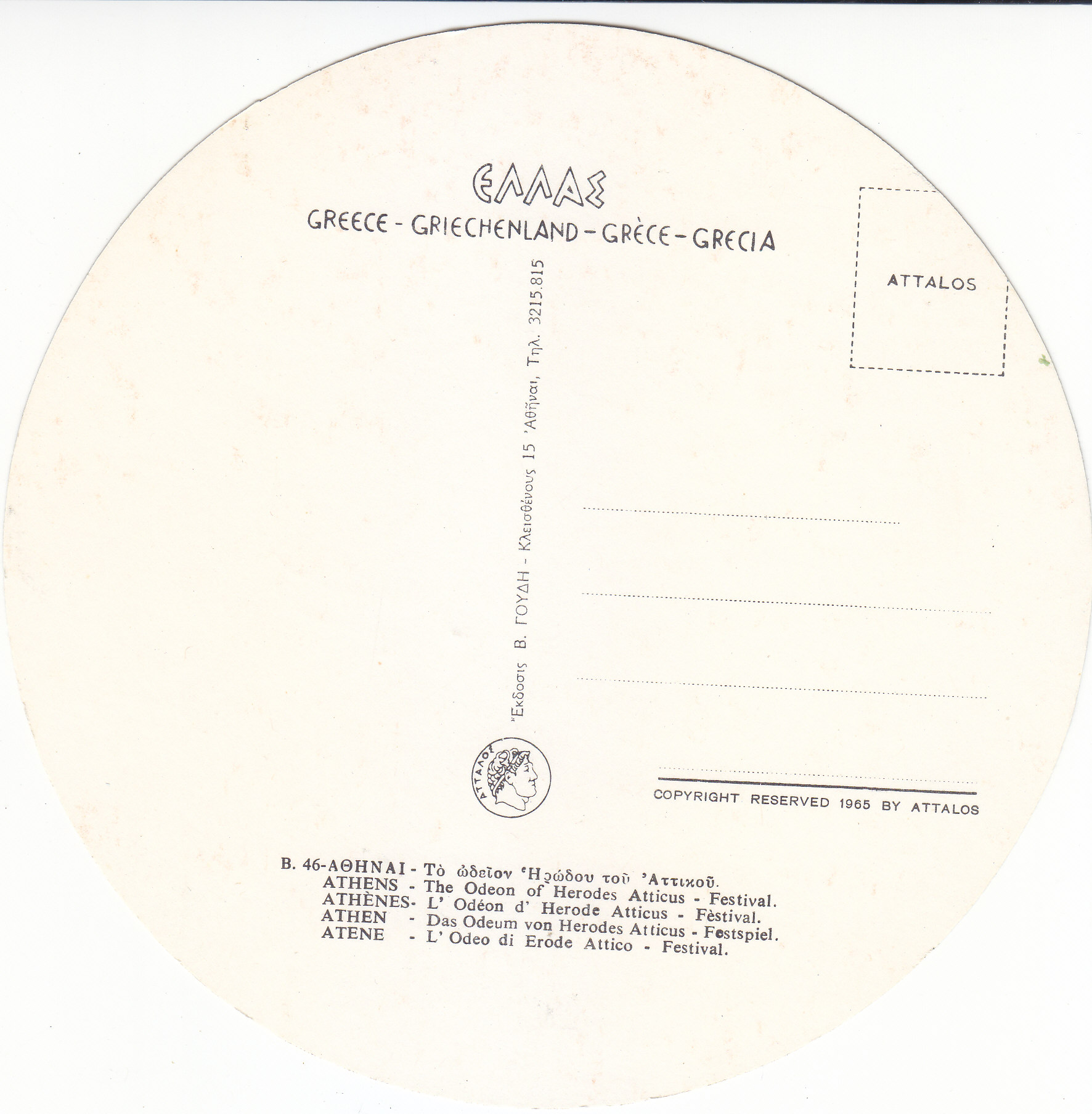POSTCARD #180 Athens [Greece]. B. 46. Copyright Reserved 1965 by Attalos. [Address in Greek.]. 6" diameter. VG