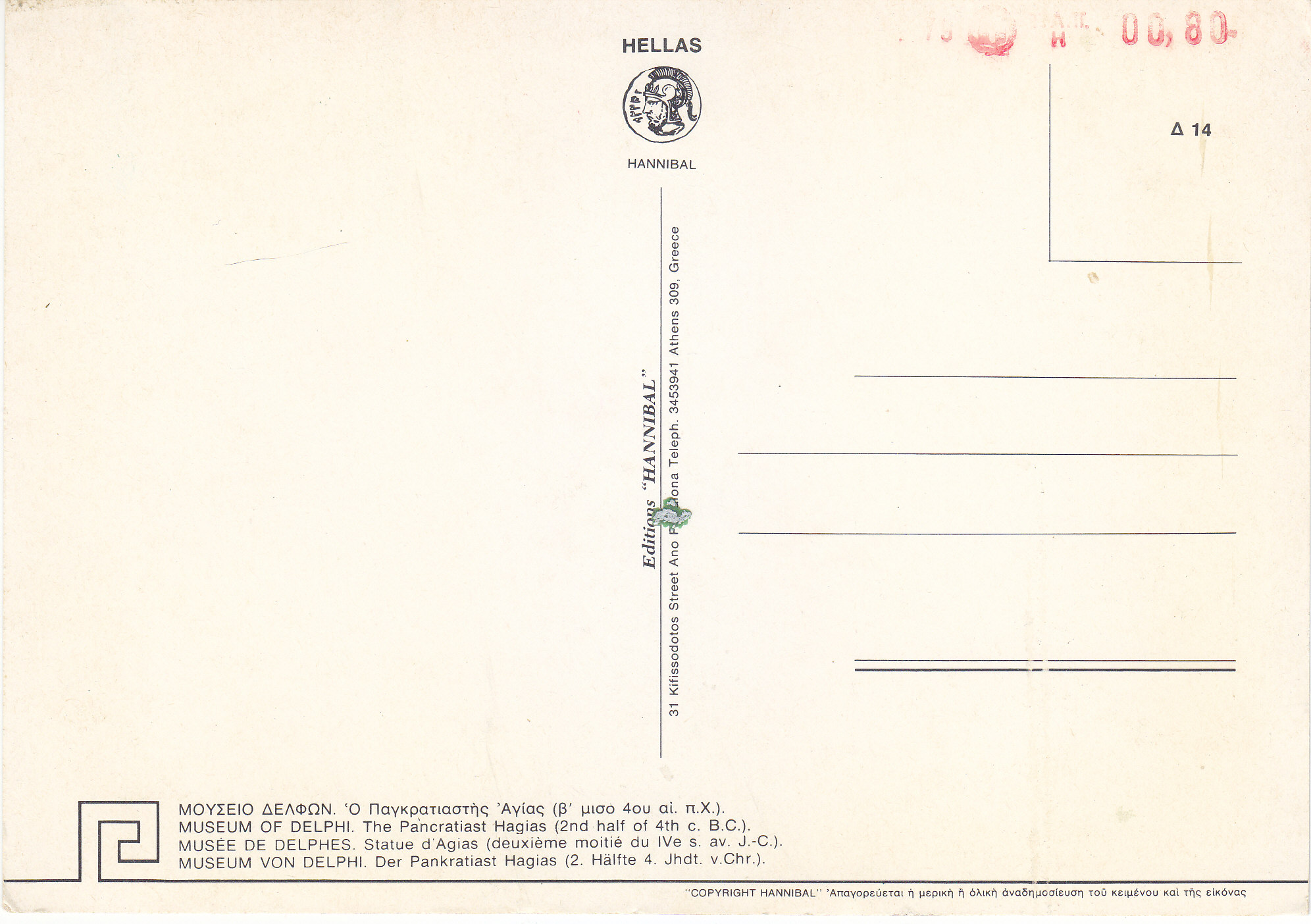 POSTCARD #184 Statue of Hagias (2nd half 4th c. BC.) Museum of Delphi. Greece. Hannibal. Copyright Hannibal. Editions Hannibal. 31 Kifissodotos Street, Ano Petralona, Teleph. 3453941, Athens (Greece). 14. [Some untranslated writing in Greek.]. 6.5" x 4.75" VG