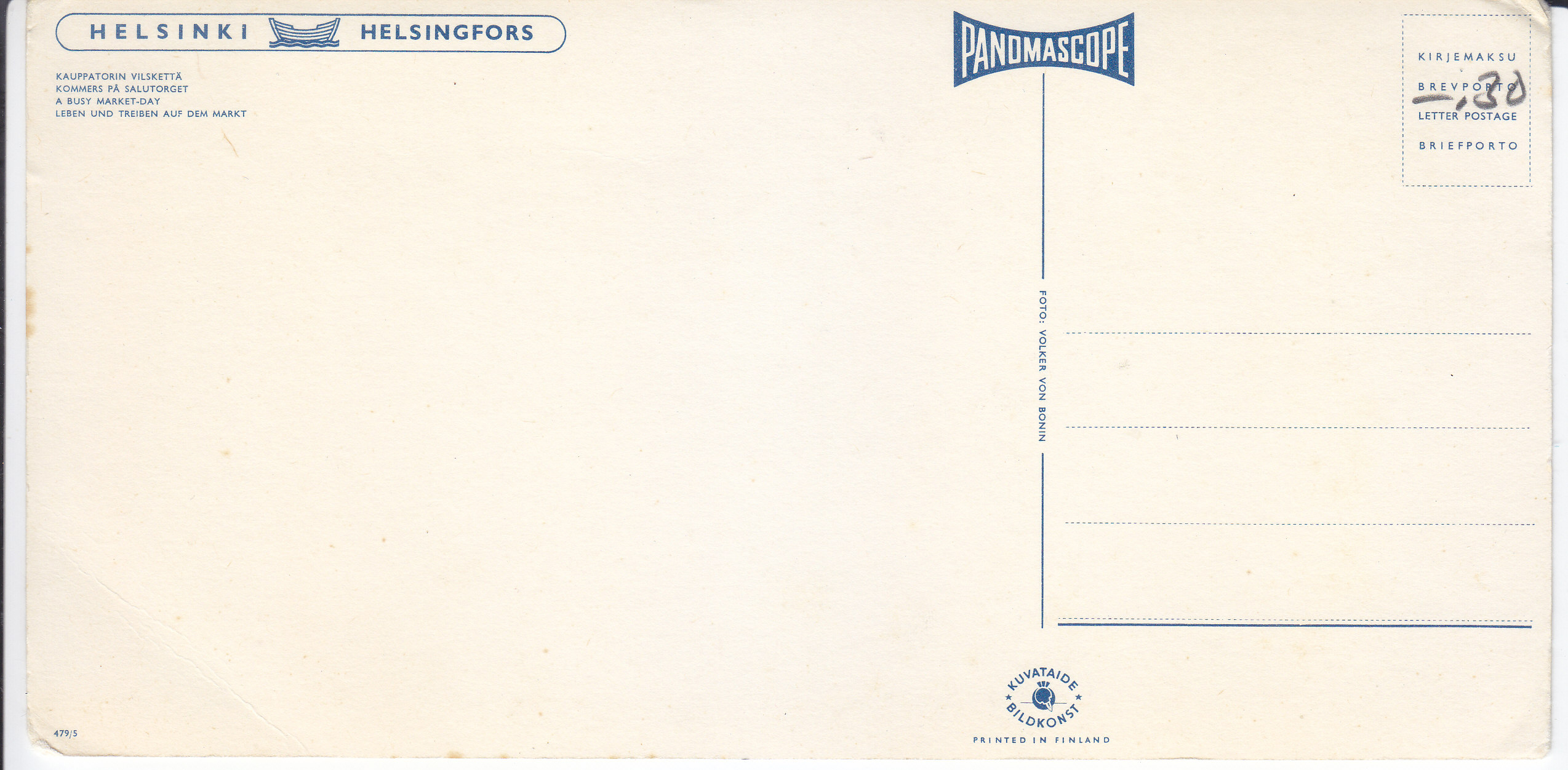 POSTCARD #191 A Busy Market Day. Helsinki [Finland]. Panomascope, Kuvataide Bildkonst. Printed in Finland. 479/1. 8.25" x 4" FR/GD