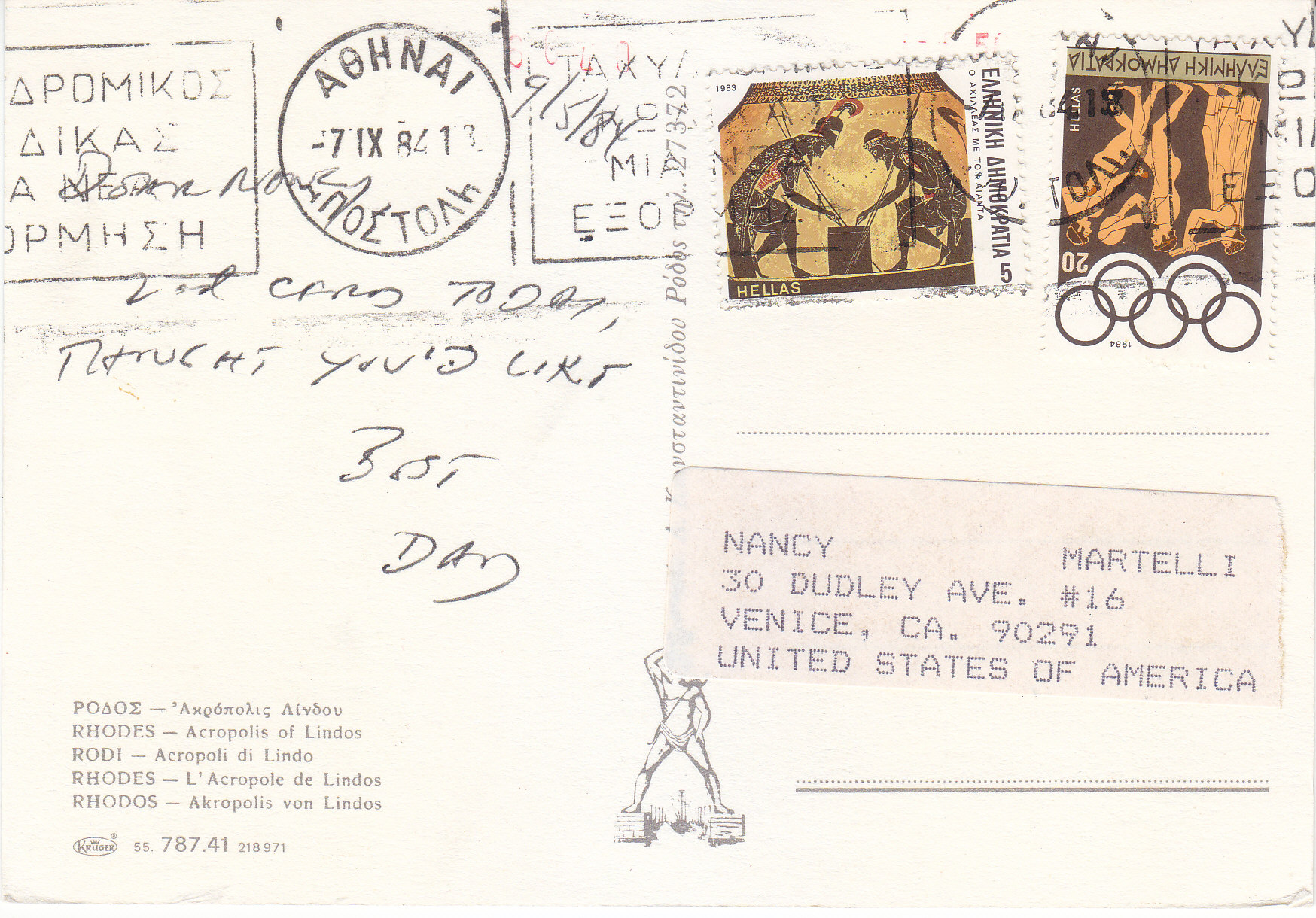 POSTCARD #205 Acropolis of Lindos, Rhodes [Greece]. Kruger. 55.787.41 218 971. [Address in Greek.]. 5.75" x 4" EXC
