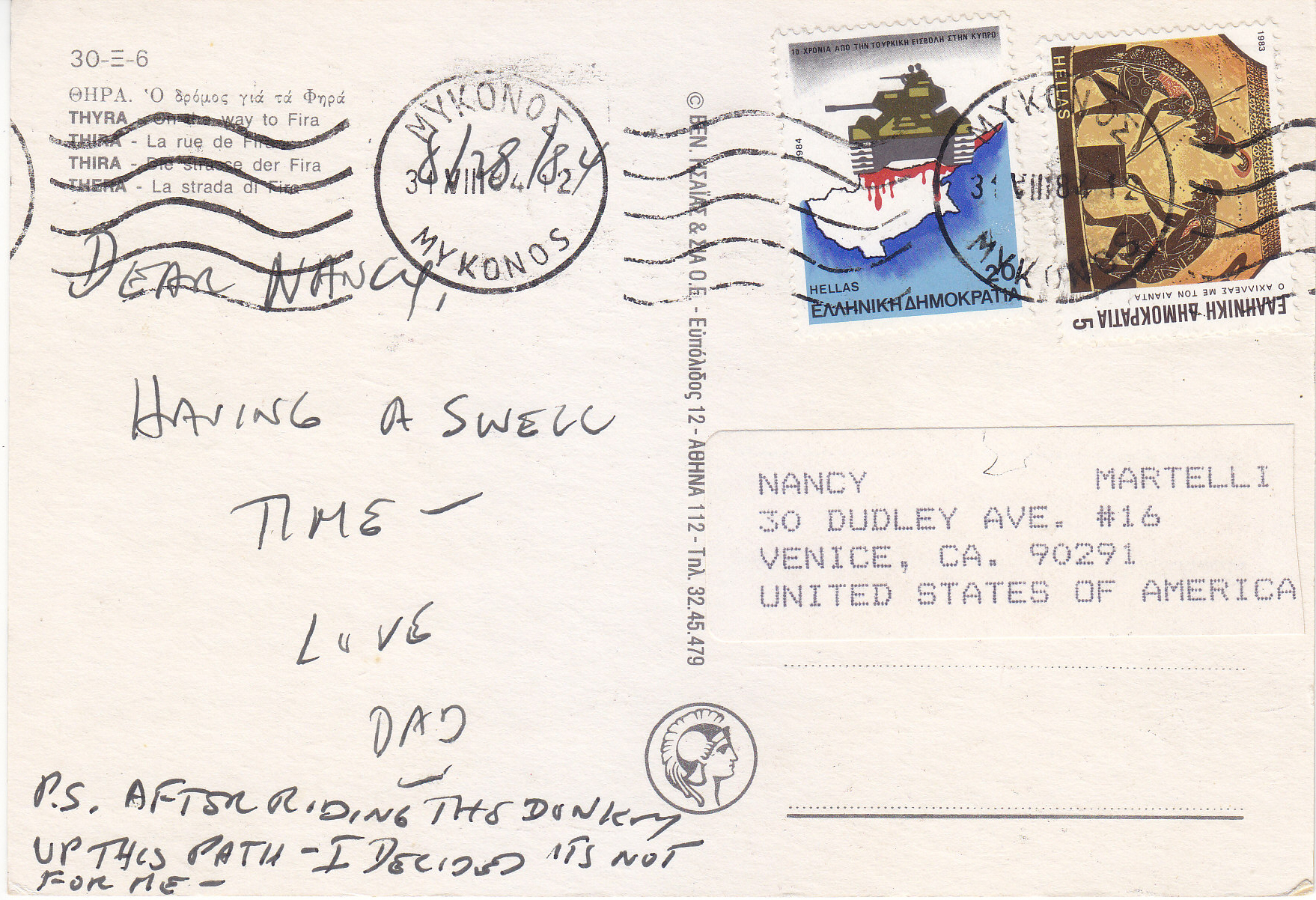 POSTCARD #211 Thyra [Thera, Greece]. On the way to Fira. 30-6. [Address printed in Greek.]. 5.75" x 4" VG