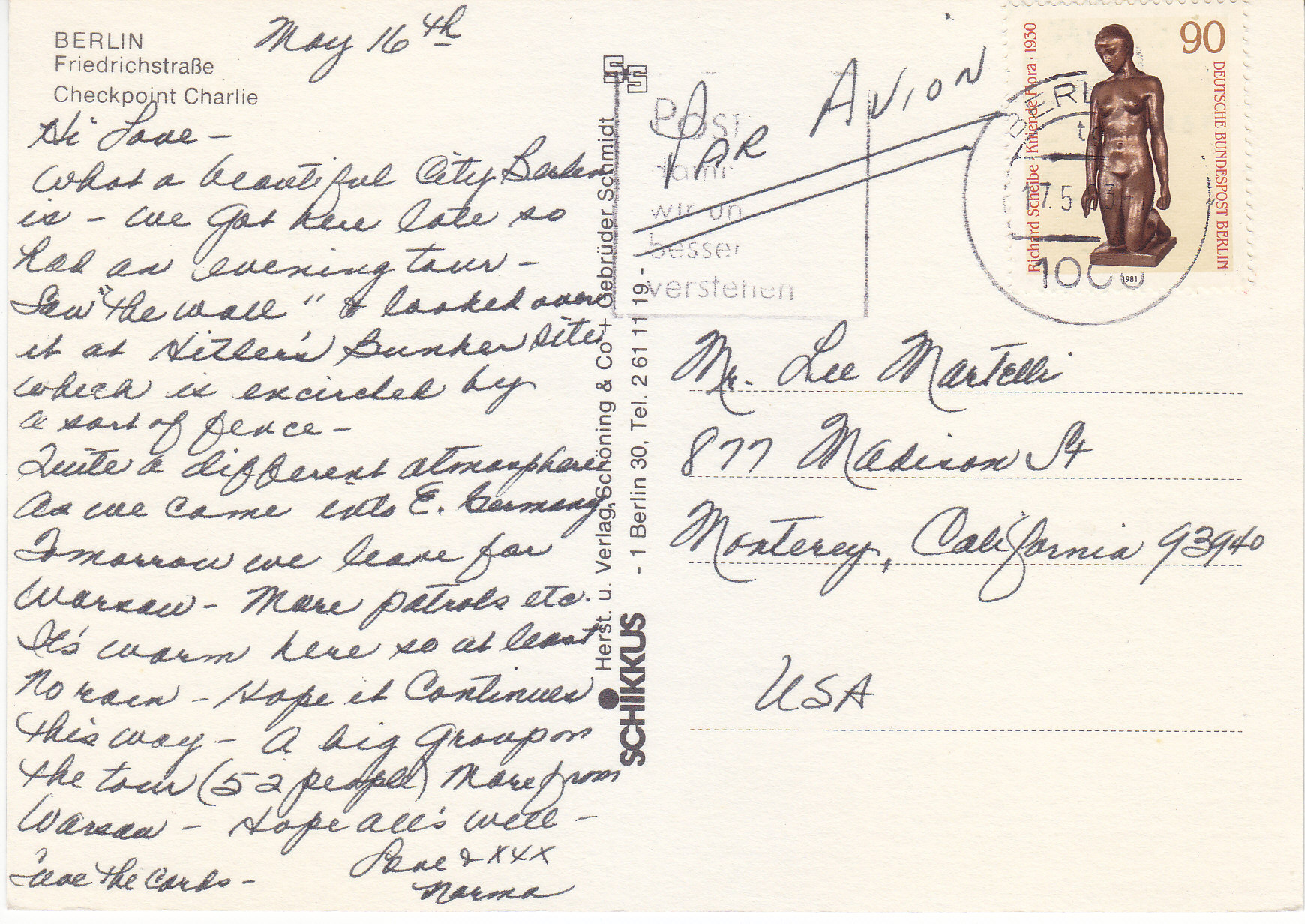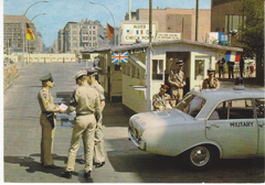 POSTCARD #242 Checkpoint Charlie, Berlin [Germany]. Schikkus, 1 Berlin 30, Tel. 2 61 11 19. Herst. u. Verlag Schöning & Co - Gebrüder Schmidt. 5.75" x 4" EXC