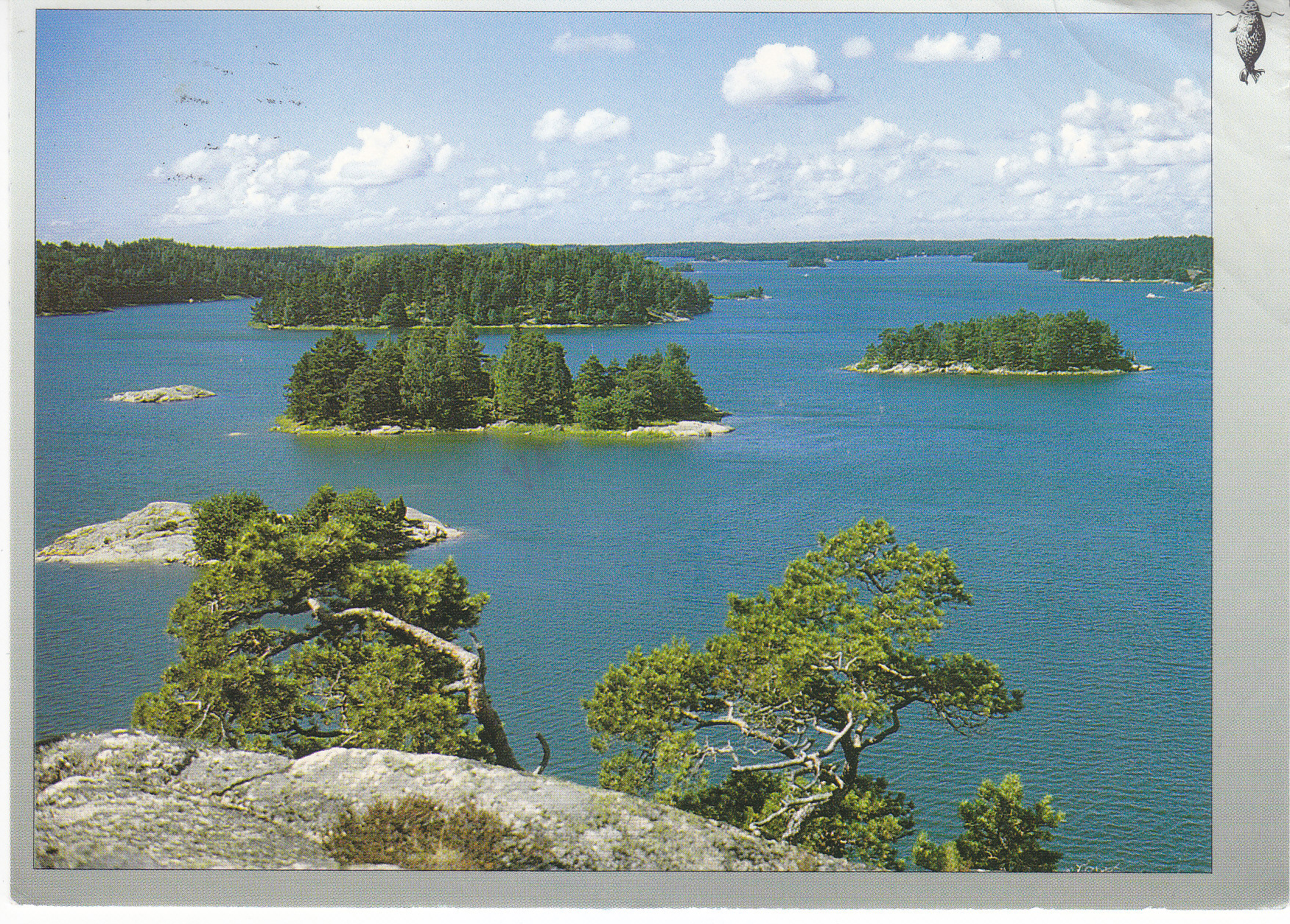 POSTCARD #246 Archipelago Sea [a Finnish archipelago of between 250 and 17,000 islands/islets off the coast of Turku/Åbo, Finland, bordered by the Bay of Bothnia and the Gulf of Finland, and contiguous with the Åland Islands]. Jo männyistä tuntee meren saariston [From the pine trees you already know the archipelago sea]. Foto: Matti Valta. The Finnish Association for Nature Protection. Paperitaide. 5.75" x 4" VG