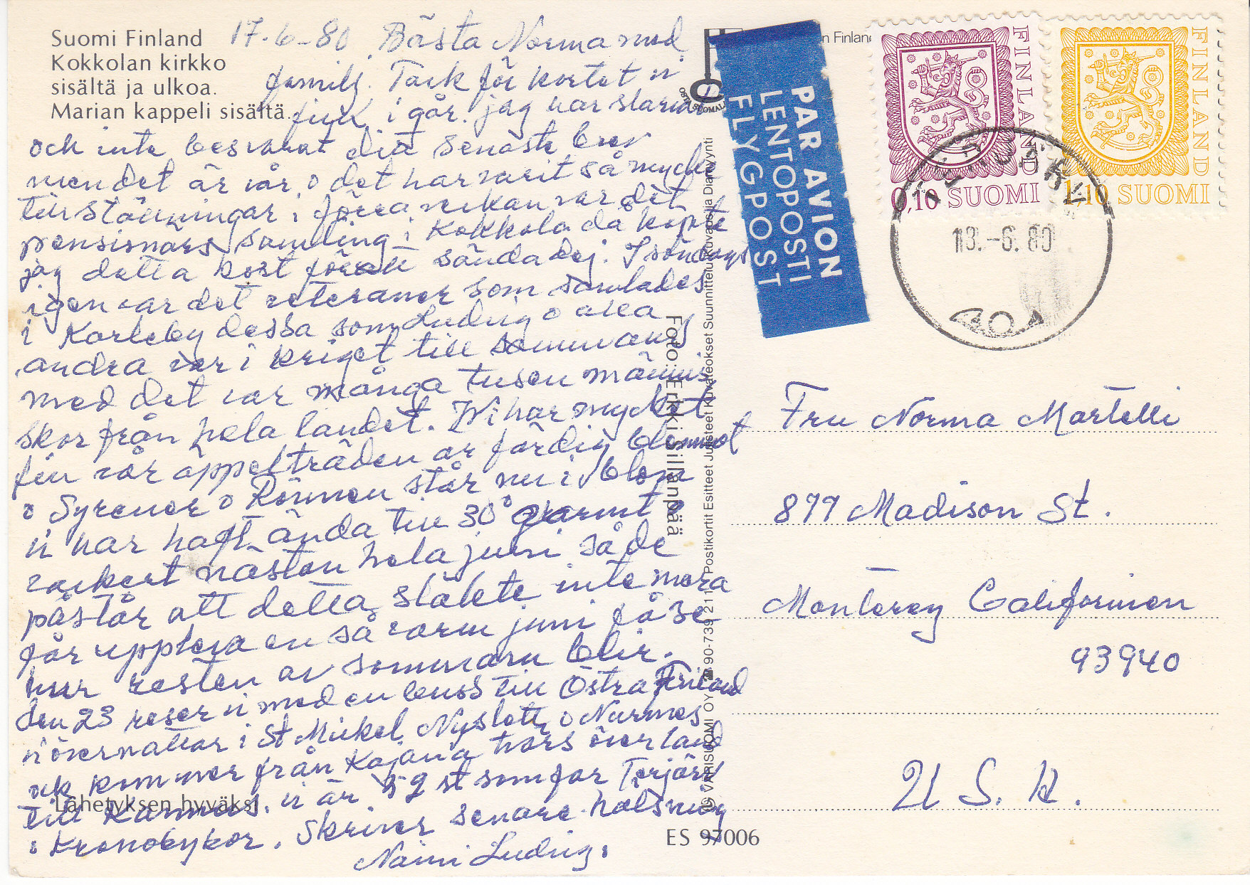 POSTCARD #247 Kokkola Church [Kokkola, Suomi/Finland]. ES 92006. Varisuomi Oy 90-739-211. Postikortit Esitteet Kuvateokset Suunnittelu Kuvausija Diareyynyi. (Spelling inexact on this last sentence as written message obscures some of the letters.) Lähetyksen hyväks. Foto: Erkki Silinpää. 5.75" x 4" EXC