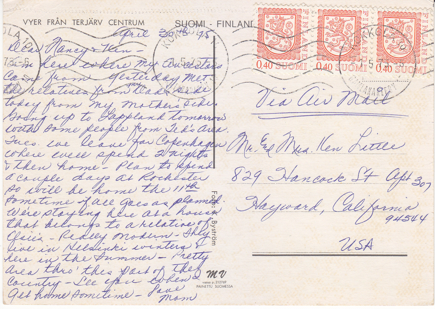 POSTCARD #254 Suomi-Finland. 425. [Probably a photo of Larsmo, Suomi/Finland.] GTR Tuonti Import. Groko. Foto: Giovanni Trimboli. 5.75" x 4" VG