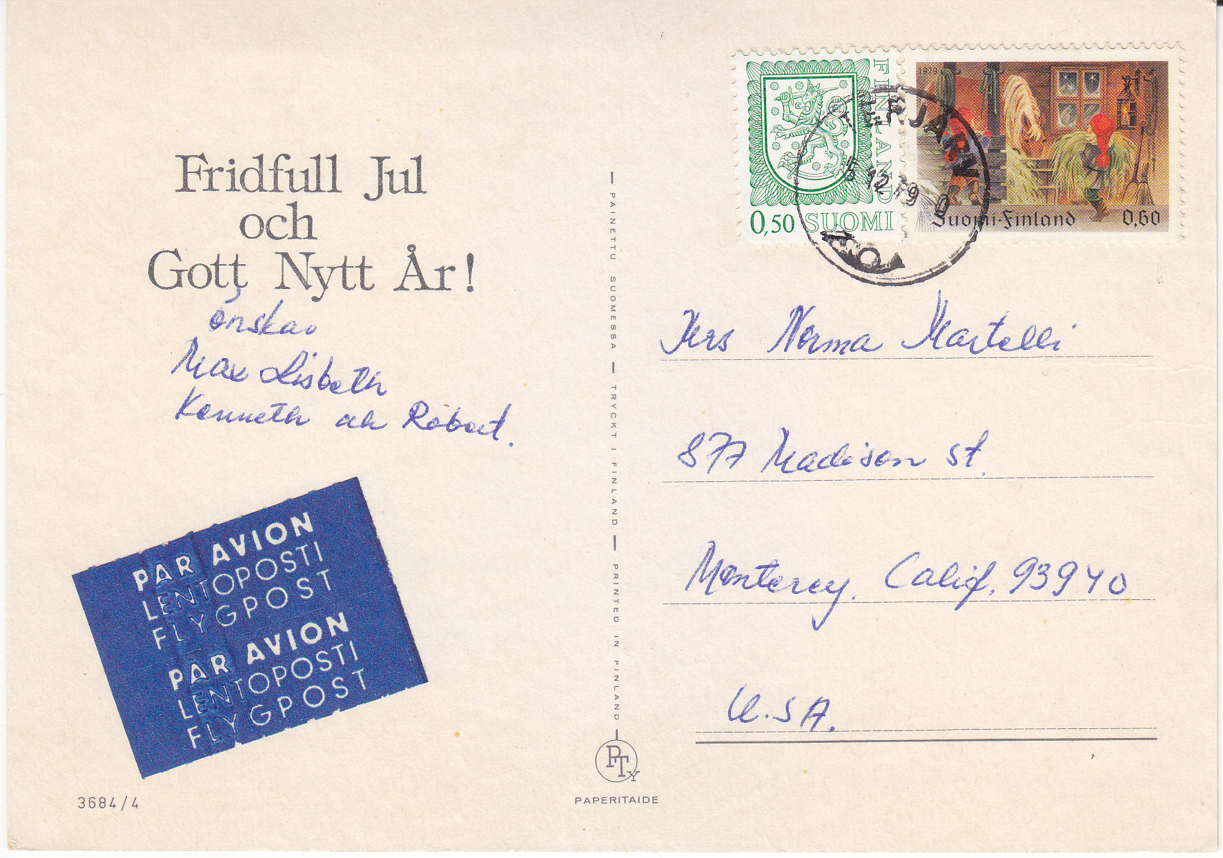 POSTCARD #264 Fridfull Jul och Gott Nytt År! [Peaceful Christmas and Happy New Year!, Suomi/Finland]. 3684/4. Paperitaide. Painettu Suomessa. Tryckt. Finland. Printed in Finland. 5.75" x 4" EXC