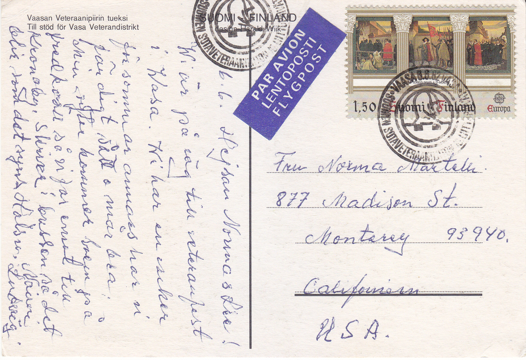 POSTCARD #266 Vaasan Veteraanipiirin tueksi, Til stöd för Vasa Veterandistrikt [To support the Vaasa Veterans District.] [Suomi/Finland.] 5.75" x 4" VG
