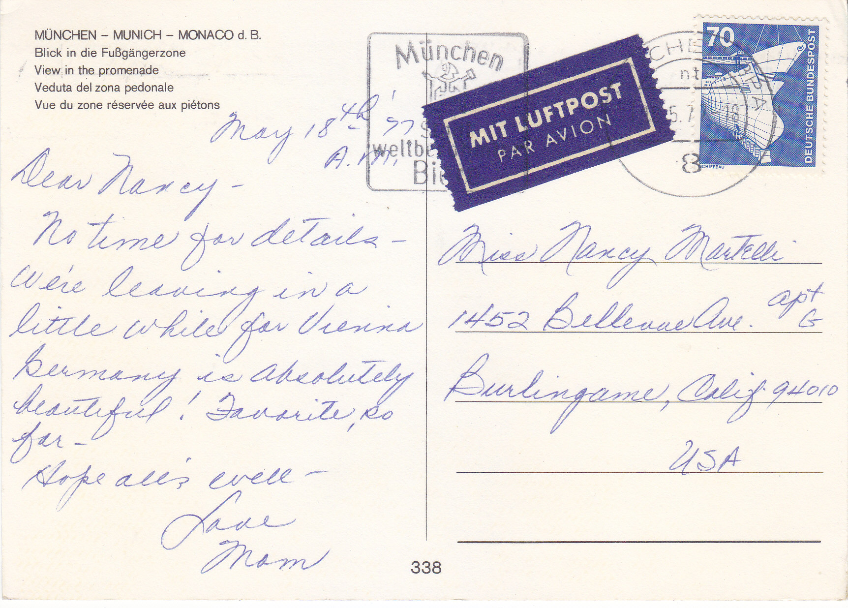 POSTCARD #277 View in the Promenade. [Munich, Germany]. 338. 5.75" x 4" VG