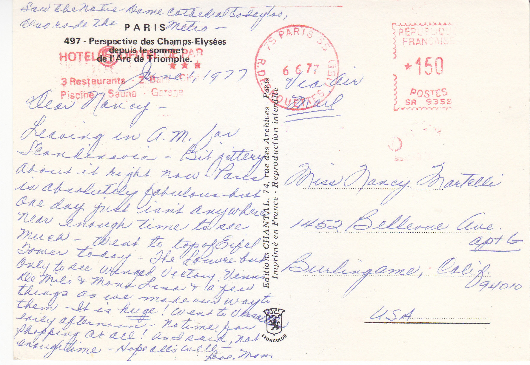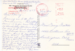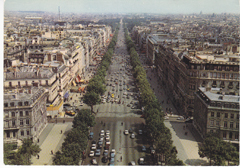 POSTCARD #280 Perspective des Champs-Elysées depuis le sommet de l'Arc de Triomphe [View of the Champs-Elysée from the top of the Arc de Triomphe, Paris, France]. 497. Editions Chantal, 74 rue des Archives, Paris [France]. Imprimé en France. Reproduction Interdite. 5.75" x 4" VG