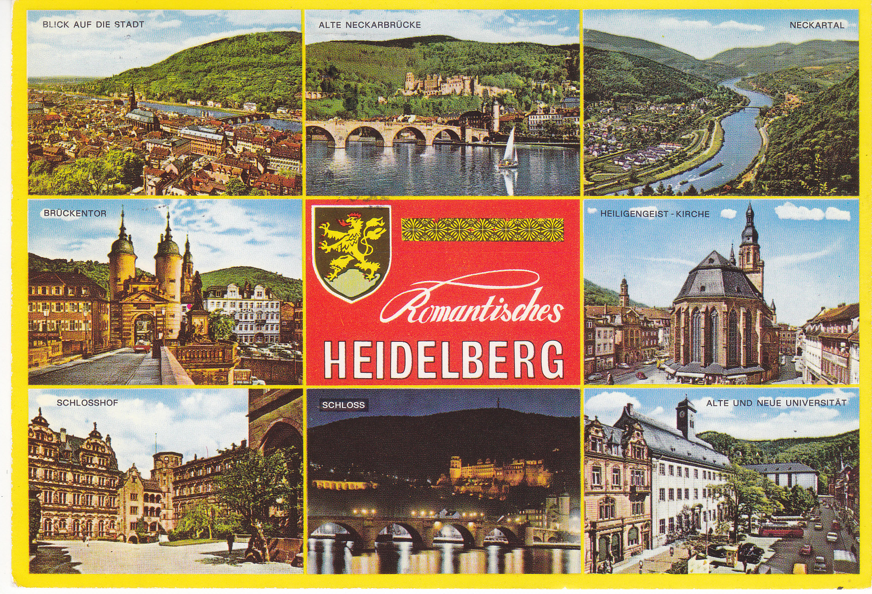 POSTCARD #291 Romantisches Heidelberg [Germany]. Heidelberg am Neckar [Heidelberg on the Neckar River]. Kruger 31. 938.103 264596. Photos clockwise from upper left: Blick auf die Stadt (View of the City); Alte Neckarbrücke; (Old Neckar Bridge); Neckartal (Neckar Valley); Brückentor (Bridge Gate); Heiligengeist Kirche (Holy Spirit Church); Schlosshof (Castle Courtyard); Schloss (Castle at Night); Alte und Neue Universität (Old and New University). Kuntsverlag Herbert Grochla, 6901 Nussloch. 5.75" x 4" VG