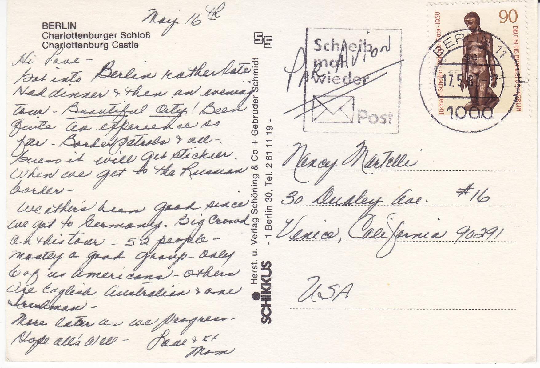 POSTCARD #296 Charlottenburg Castle, Berlin [Germany]. Herst. u. Verlag Schöning & Co + Gebrüder Schmidt, 1 Berlin 30, Tel. 2 61 11 19. 5.75" x 4" EXC