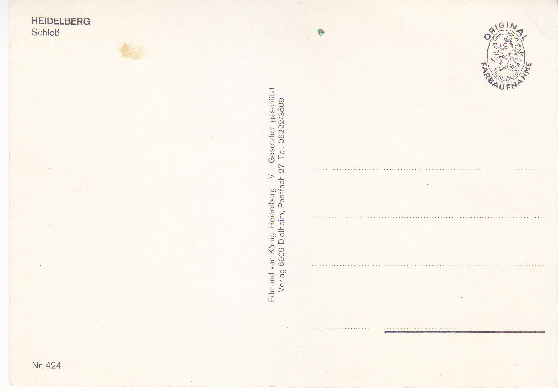 POSTCARD #328 Heidelberg Castle. Heidelberg [Germany]. Nr. 424. Edmund von König, Heidelberg V Gesetzlich geschützt. Verlag 6909 Dielheim, Postfach 27, Tel. 06222/3509. Original Farbaunahme. 5.75" x 4" EXC