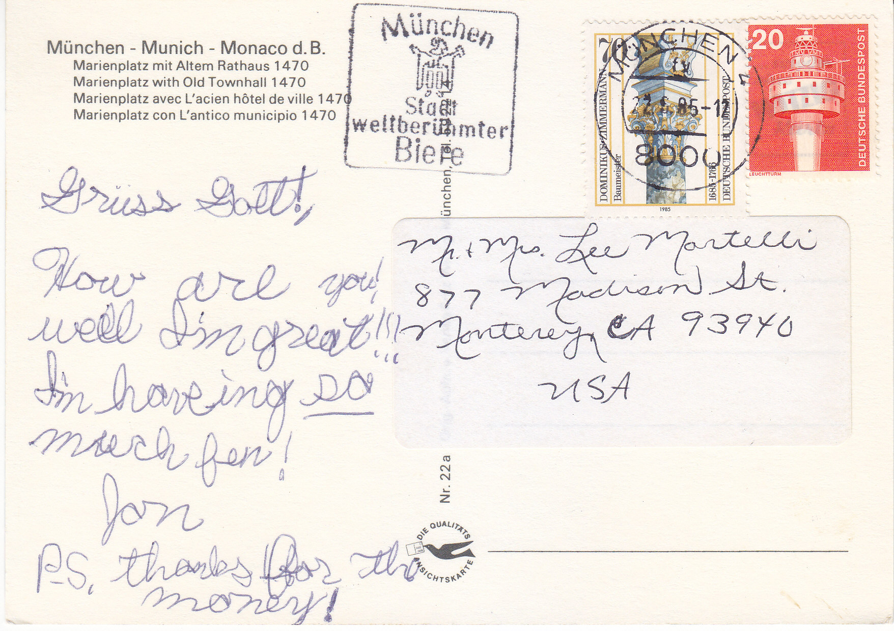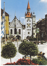 POSTCARD #342 Marienplatz and the Old Townhall, 1470 München [Munich, Germany]. [All other writing is obscured by mailing label]. 5.75" x 4" EXC