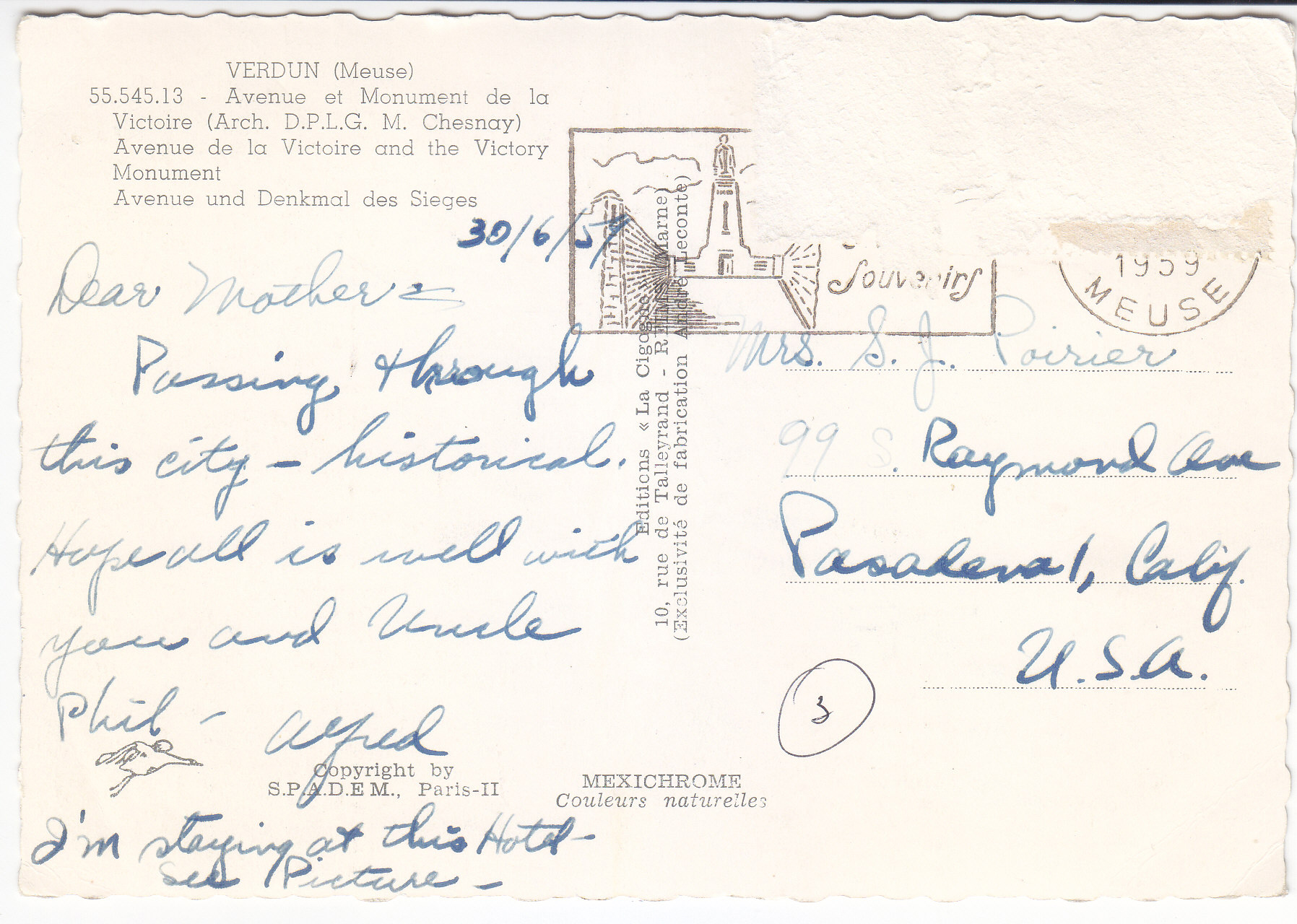 POSTCARD #349 Avenue et Monument de la Victoire (Arch. D.P.L.G. M. Chesnay), Verdun, Meuse, France]. 55.545.13. Copyright by S.P.A.D.E.M., Paris-II. Mexichrome. Coleurs naturelles. Editions La Cigogne. 10, rue de Talleyrand, Reims [Marne, France]. (Exclusivité de fabrication Andre Leconte). The surface of the photo is crackled when viewed at an angle under light. 6" x 4" FR/GD