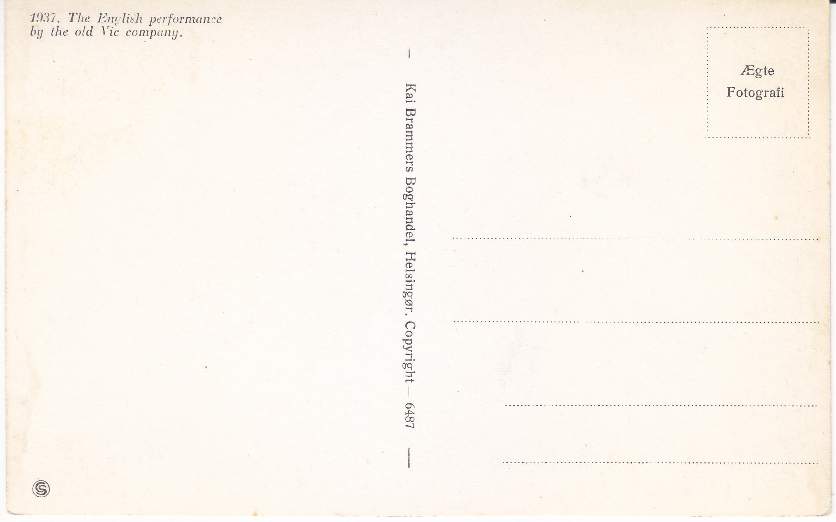 POSTCARD #363 The English performance by the old Vic Company. 1937 (Location not stated). Kai Brammers Boghandel, Helsingør. Copyright 6487. AEgte Fotografi. 5.5" x 3.5" EXC