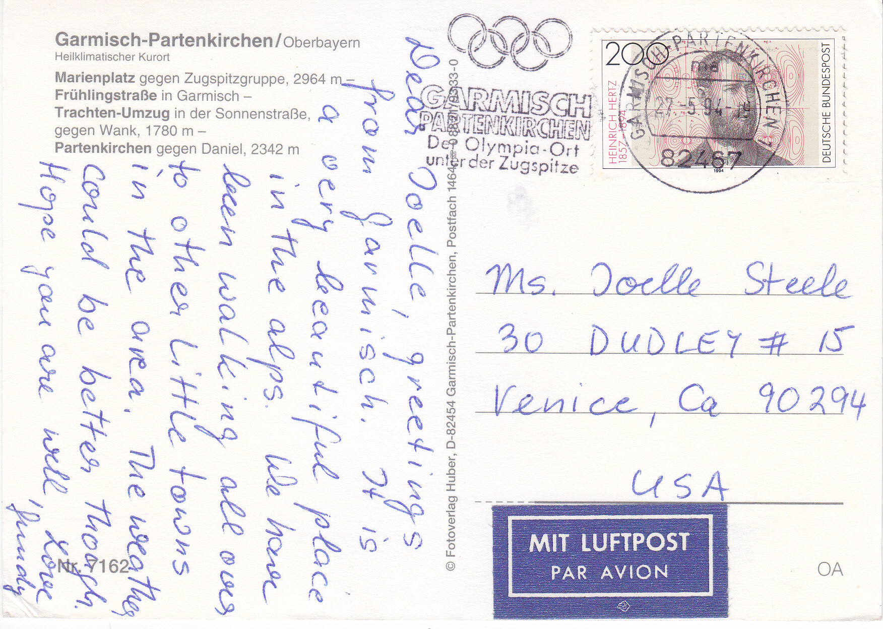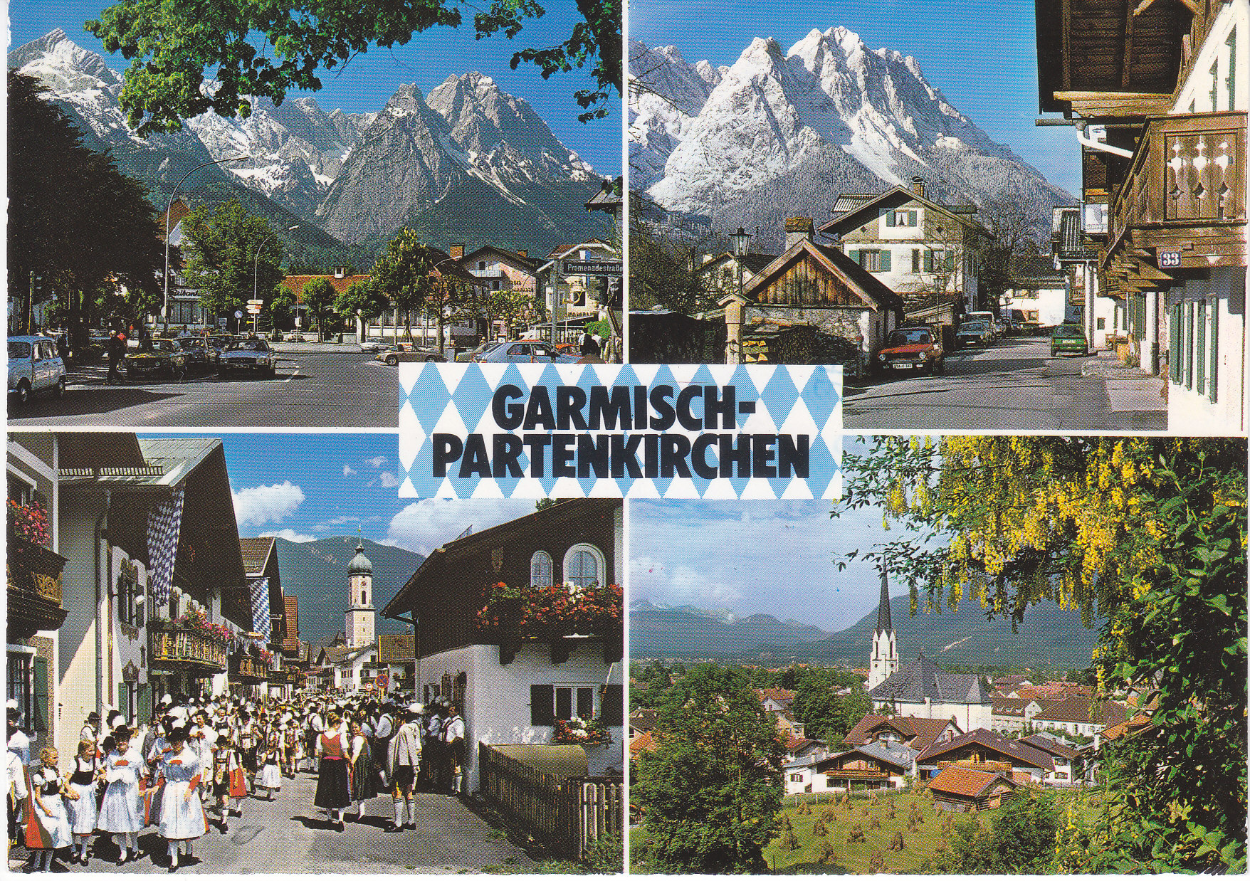 POSTCARD #404 Frühlingstrasse in Garmisch, Garmisch-Partenkirchen/Oberbayern, Heilklimatischer Kurort [Bavaria, Germany]. Nr. 7162. OA. ©Fotoverlag Huber, D-82454 Garmisch-Partenkirchen, Postfach 1464. 08821/93330 [Bavaria, Germany], Tel. 0 88 21 / 5 90 48. 5.75" x 4" VG