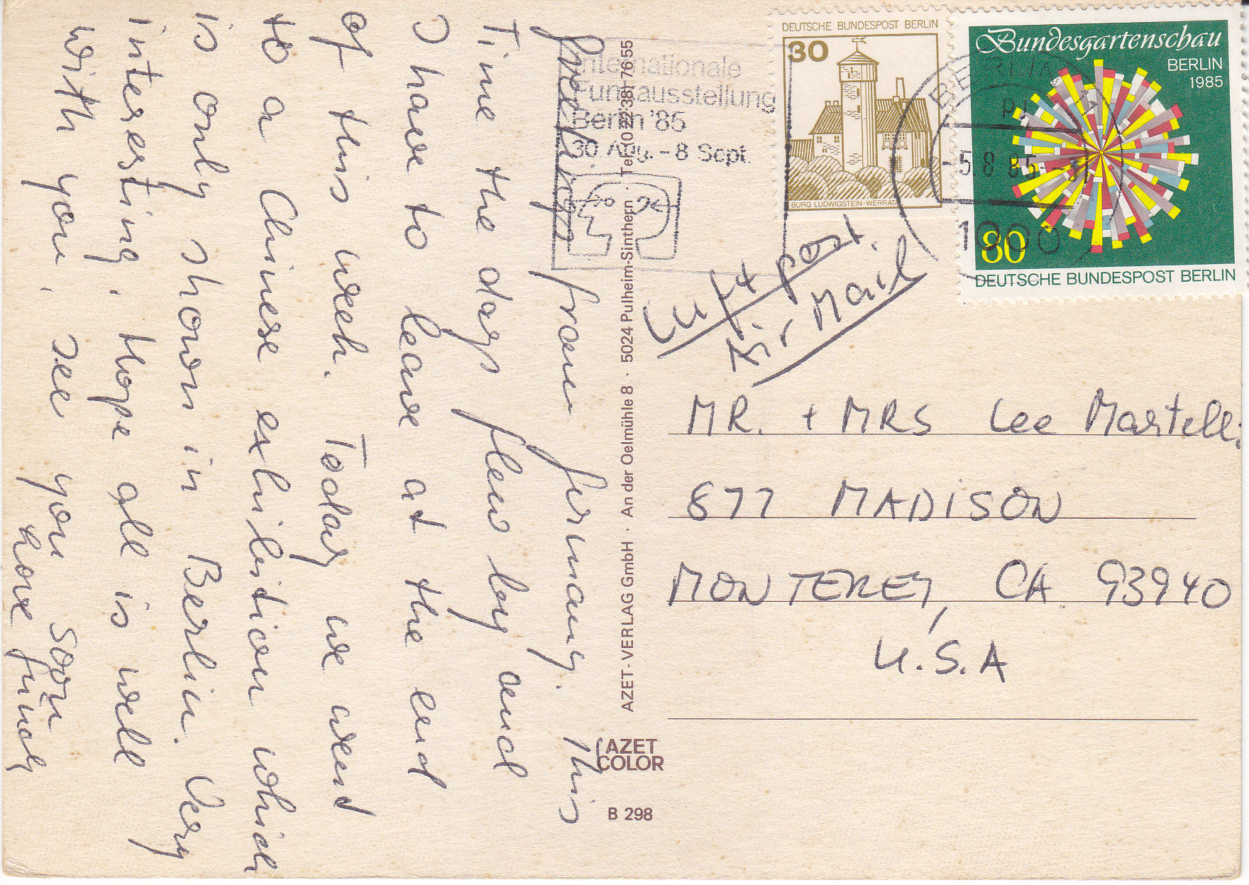 POSTCARD #406 Gruße aus Berlin. [Greetings from Berlin, Germany]. Azet Color. B298. Azet-Verlag GmbH. An der Oelmühle 8. 5024 Pulheim-Sinthern. Tel. (0 22 38) 76 55. 4" x 5.75" VG