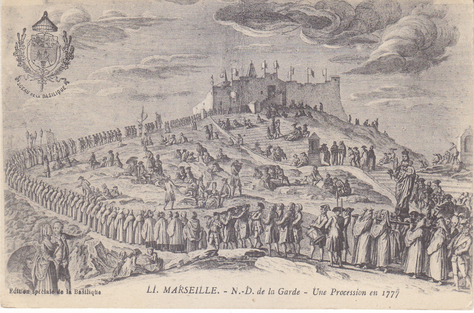 POSTCARD #435 LI. Une Procession en 1777, Marseille. N.D. de la Garde [A Procession in 1777, Notre-Dame de la Garde Basilica, Marseille, France]. Edition spéciale de la Basilique. Sceau de la Basilique. 5.5" x 3.5" EXC