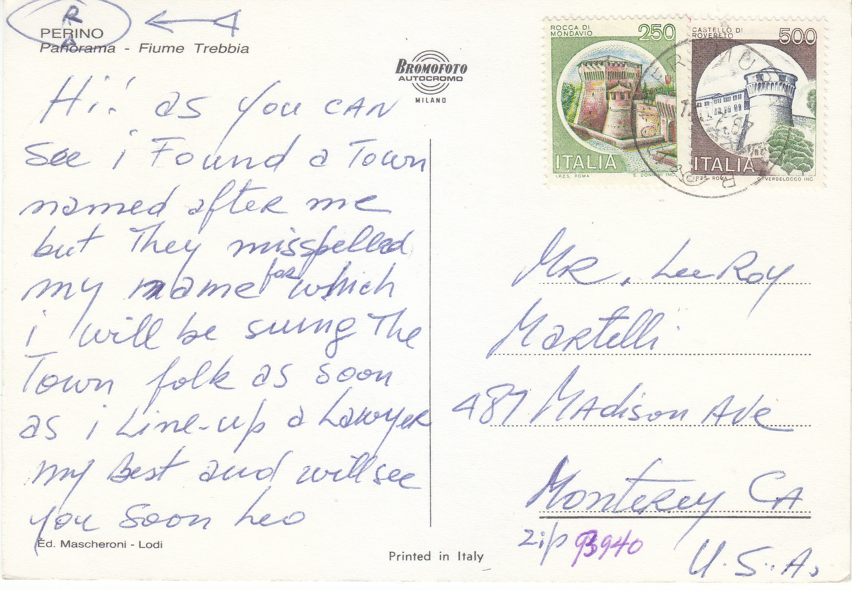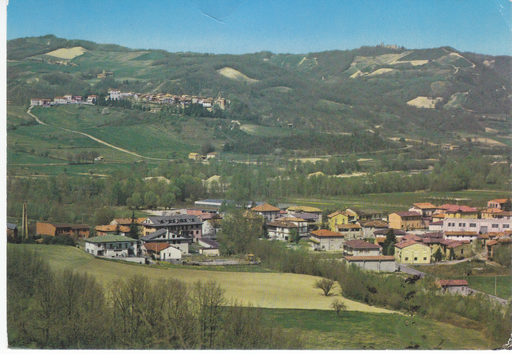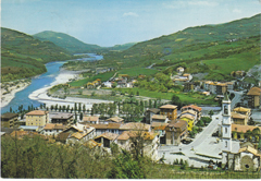 POSTCARD #046 Panorama, Perino, Fiume Trebbia [Trebbia River], Italy. Ed. Mascheroni, Lodi. Printed in Italy. Bromofoto Autocromo, Milano [Milan, Italy]. 5.75" x 4" EXC