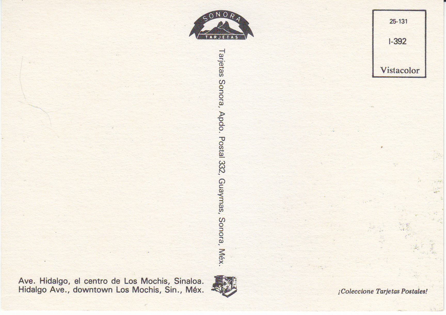 POSTCARD #050 Ave. Hidalgo, el centro de Los Mochis, Sinaloa, México. Coleccione Tarjetas Postales, Sonora Tarjetas, Apdo. Postal 332, Guaymas, Sonora, México. 5.75" x 4" EXC