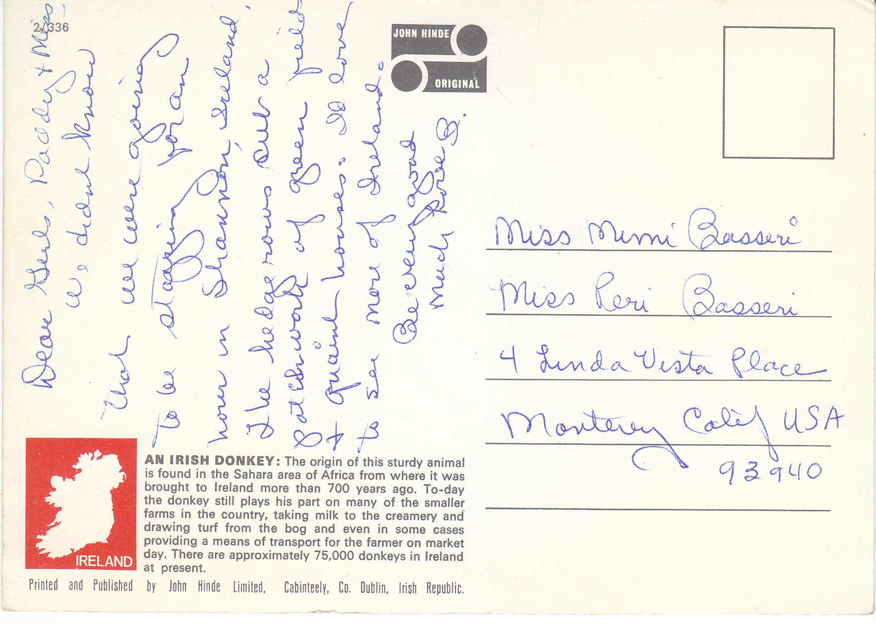 POSTCARD #084 An Irish Donkey. Photo: Joan Willis, John Hinde Studios. John Hinde Original. An Irish Donkey: The origin of this sturdy animal is found in the Sahara area of Africa from where it was brought to Ireland more than 700 years ago. To-day the donkey still plays his part on many of the smaller farms in the country, taking milk to the creamery and drawing turf from the bog and even in some cases providing a means of transport for the farmer on market day. There are approximately 75,000 donkeys in Ireland at present. Printed and Published by John Hinde Limited, Cabinteely, Co. Dublin, Irish Republic. 5.75" x 4.25" VG