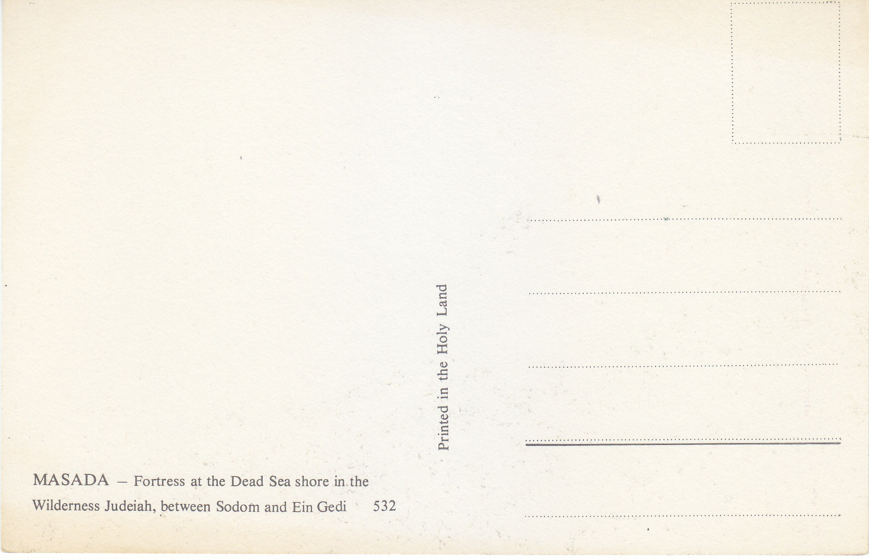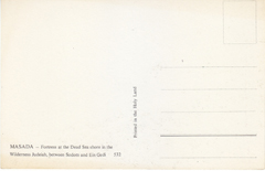 POSTCARD #085 Masada [Israel]. Fortress at the Dead Sea shore in the Wilderness Judeiah, between Sodom and Ein Gedi. 532. Printed in the Holy Land. 5.75" x 3.75" EXC