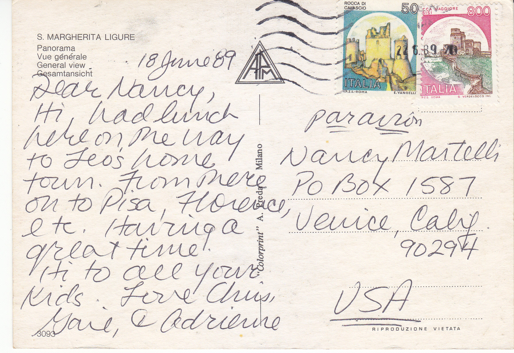 POSTCARD #154 General View Panorama, S. Margherita Ligure [Italy]. 3093. APM. Colorprint A. Preda, Milano [Milan, Italy]. Riproduzione Vietata. 6" x 4" VG
