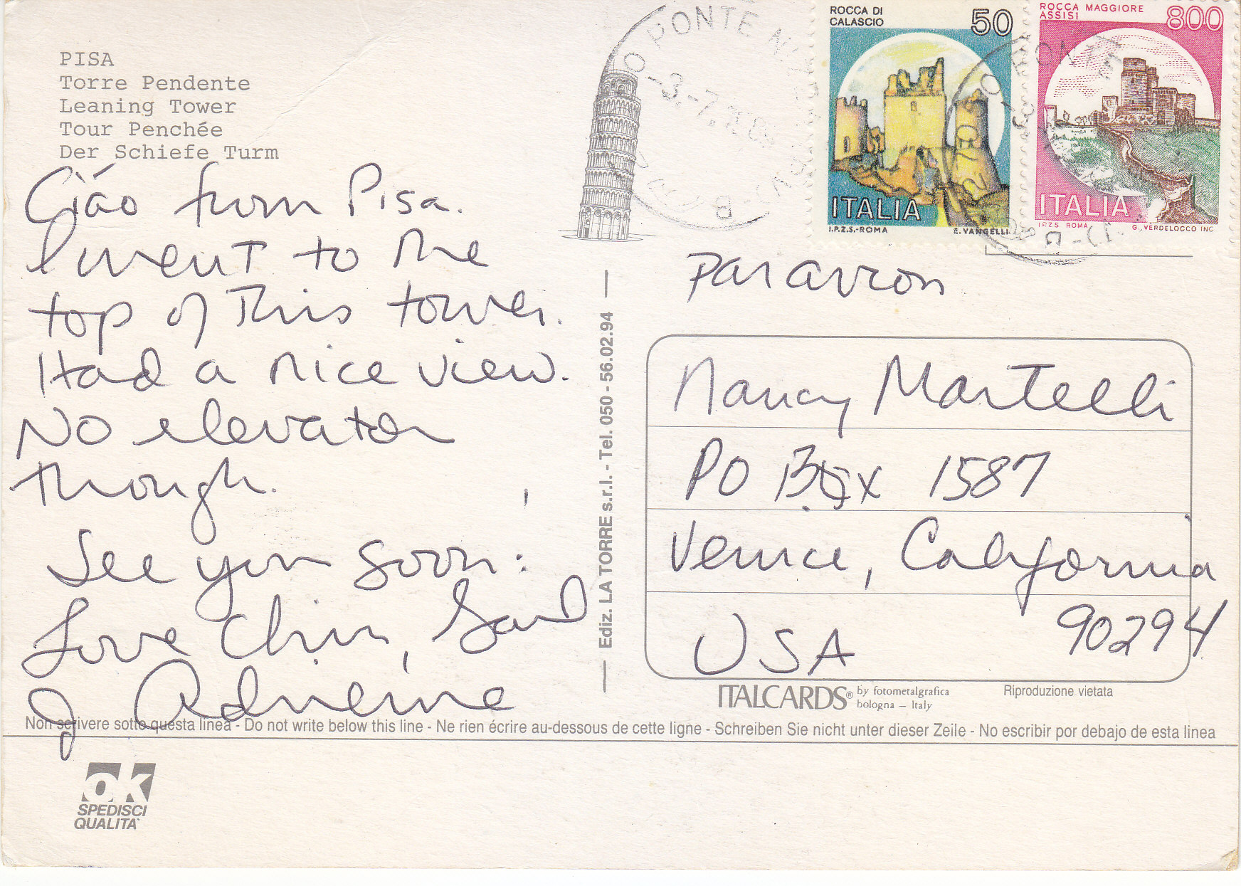 POSTCARD #155 Leaning Tower of Pisa [Pisa, Italy]. Spedici Qualita. Italcards by Fotometalgrafica, Bologna, Italy. Riproduzione vietata. Ediz. La Torre, s.r.l., Tel. 050-56.02.94. 6" x 4" VG