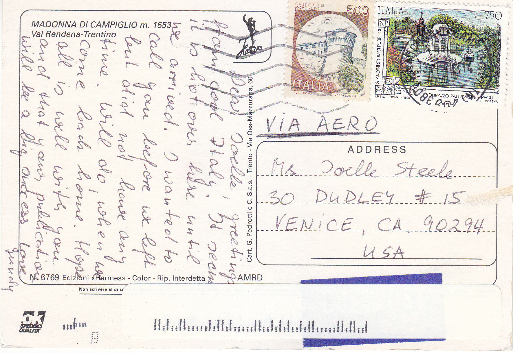 POSTCARD #158 Madonna di Campiglio m. 1553, Val Rendena, Trentino [Italy]. N. 6769. Edizioni Hermes. Color. Rip. Interdetta. AMRD. Spedisci Qualita. Cart. G. Pedrotti e C.S.a.s. Trento [Italy], Via Osa-Mazzurana, 60. 6" x 4" VG
