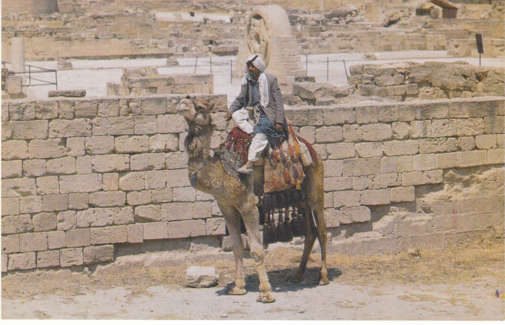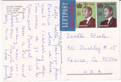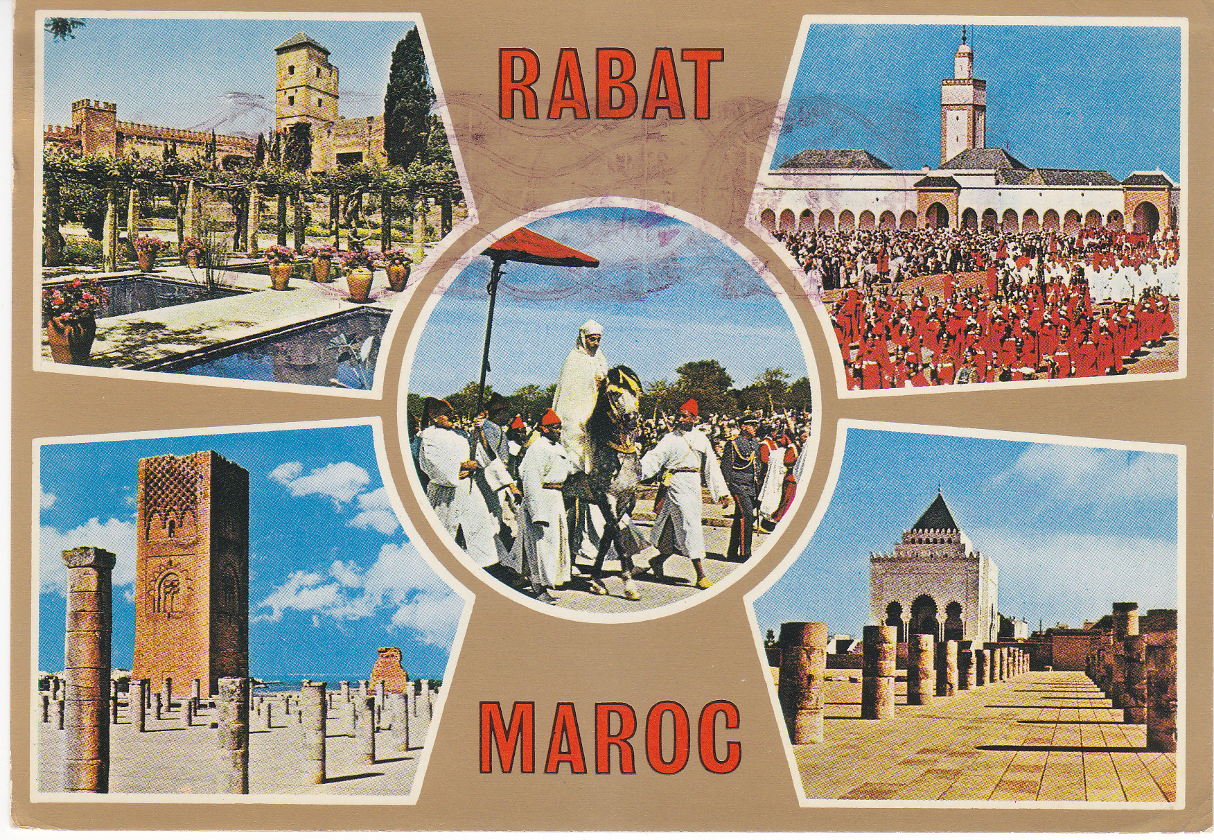 POSTCARD #287 Rabat, Maroc [Morocco]. Center: S.M. Hassan II se rendant à la prière du Vendredi [S.M. Hassan going to morning prayer]; Upper Left: Le Jardin des Oudaïas [Garden of the Oudaïas, also spelled Udayas after the Arabic tribe that built the temple/mosque]; Lower Left: La Tour Hasson [Hasson Tower]; Upper Right: La Garde Royale devant la Mosquee [Royal Guard in front of the Mosque]; Lower Right: Le Mausolee Mohamed V [the tomb of Mohamed V]. Souvenir du Maroc. Ittahcolor. Couleurs Naturelles. Photo: Ittah. 3 rue Ibn Batouta, Casablanca [Morocco]. Tel. 714-01. Reproduction Interdite. 5.75" x 4" GD