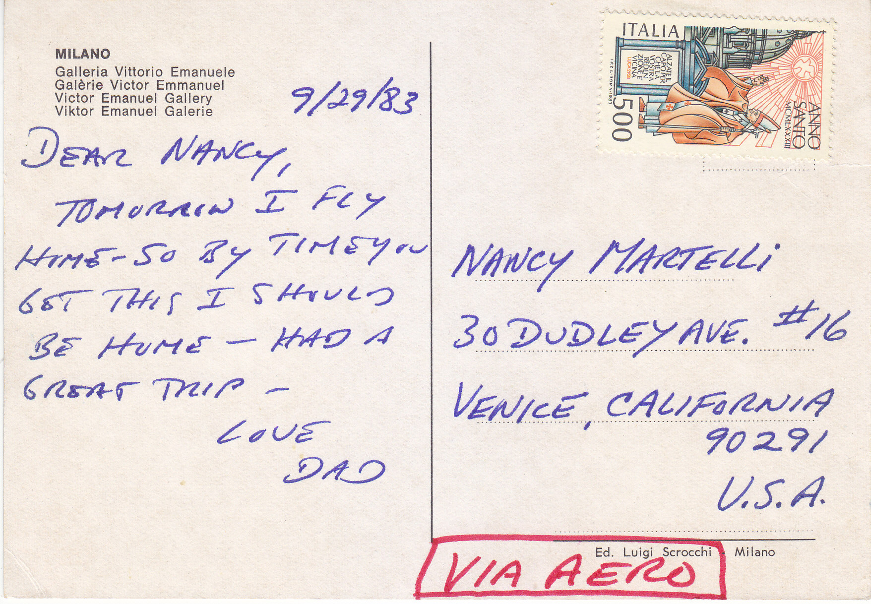 POSTCARD #214 Galleria Vittorio Emanuele, Milano [Milan, Italy]. Ed. Luigi Scrocchi, Milano [Milan, Italy]. 5.75" x 4" VG