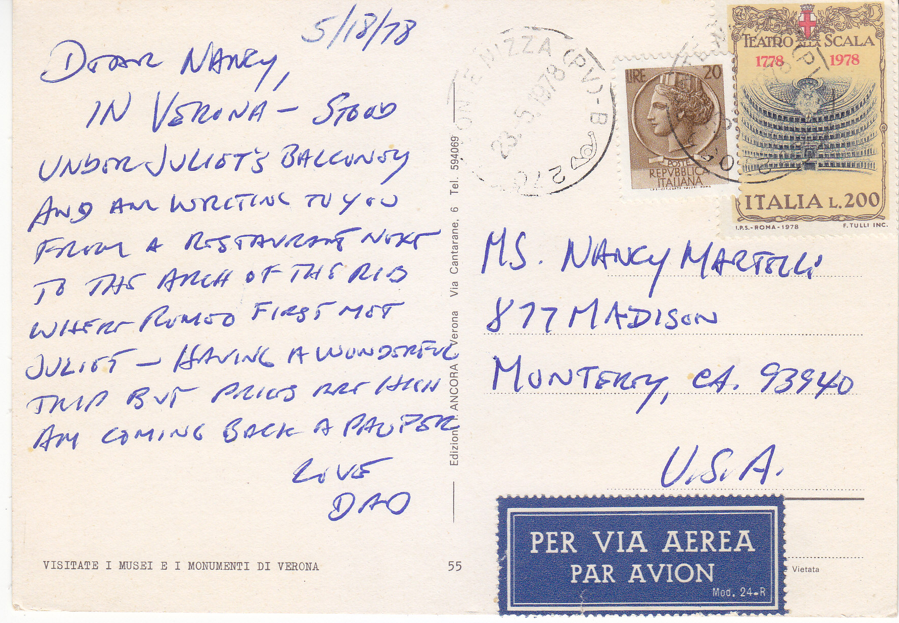 POSTCARD #218 Visitare i Musei e i Monumenti di Verona [Visit the Museums and Monuments of Verona, Verona Italy]. 55. Riproduzione Vietata. Edizion F. Ancora, Verona, Via Cantarane 6, Tel. 594069. 5.75" x 4" EXC